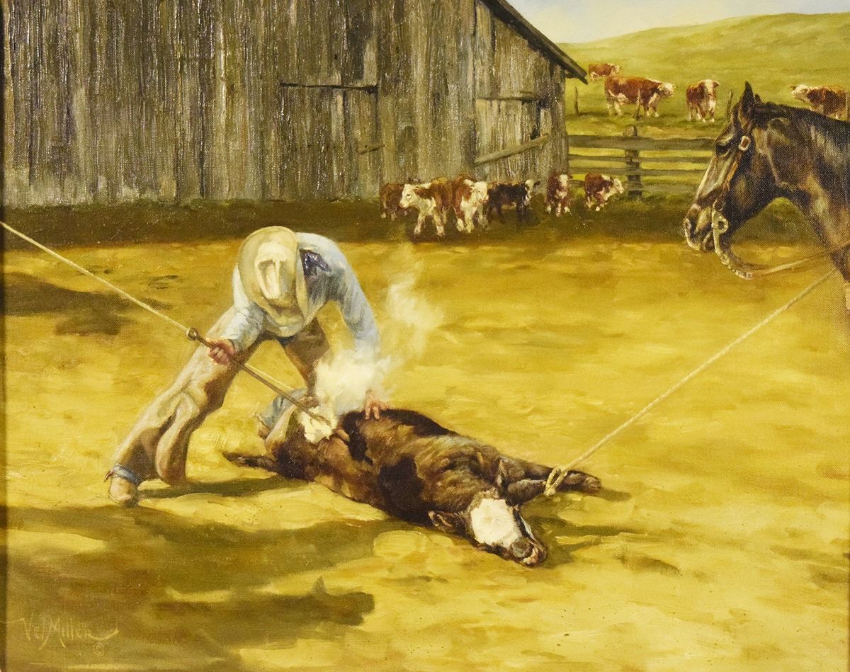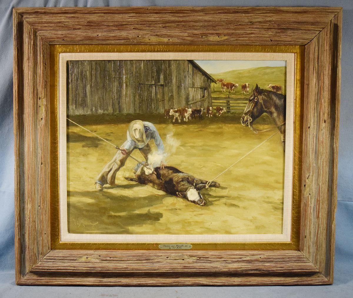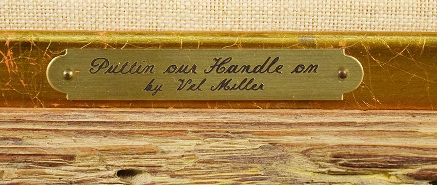 Miller, Vel, original oil on canvas, Puttin' our Handle on, 16" x 20", framed, signed lower left, artist signature on back of canvas