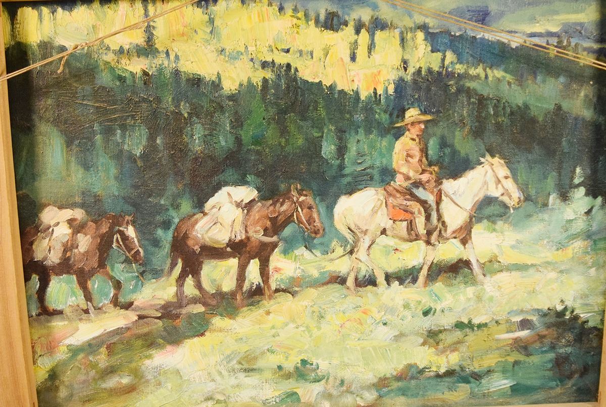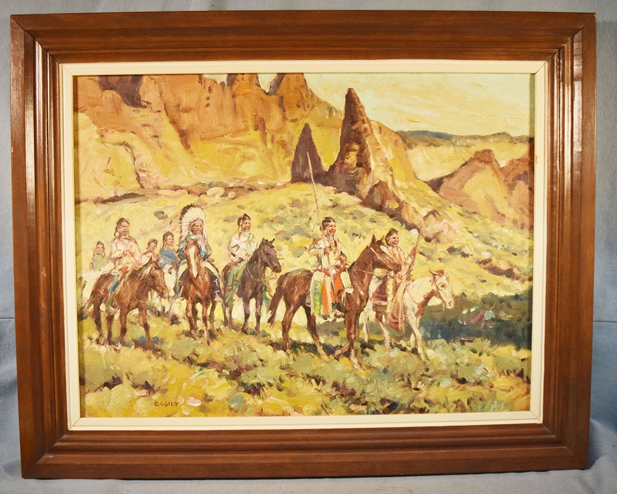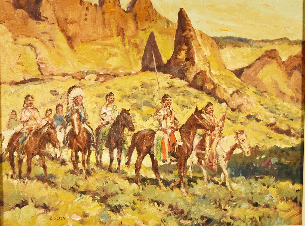 Bodily, Sheryl, original oil on canvas, The War Party, 18" x 24", framed, signed lower left, second painting, Packing In, on reverse side of canvas