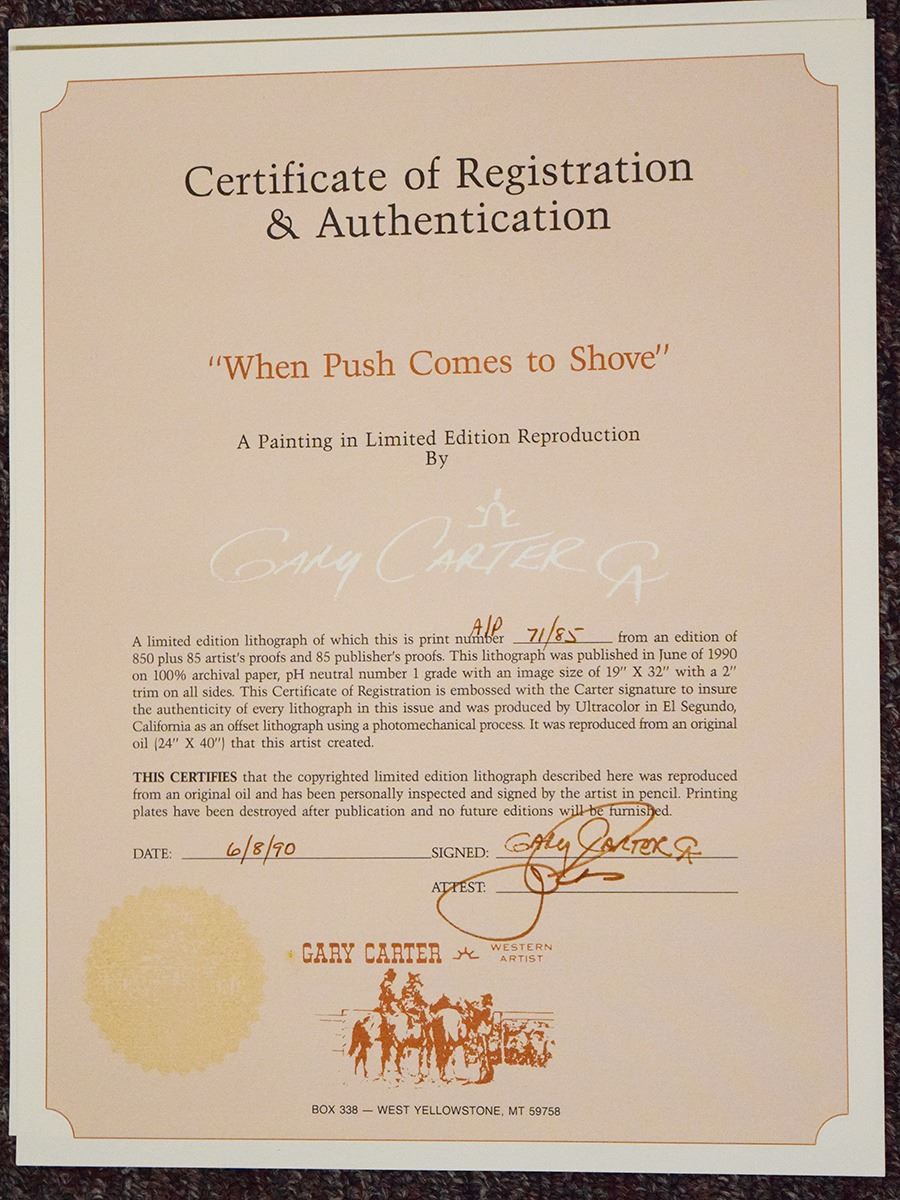 Carter, Gary, CAA, print, When Push Comes To Shove, AP #71/85, 20" x 32", framed, signed lower right, certicate of authenticity