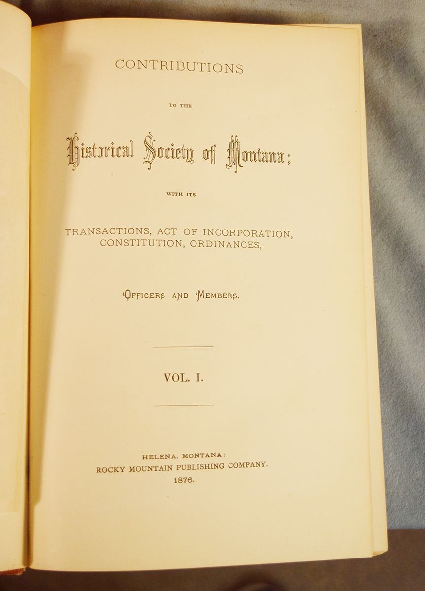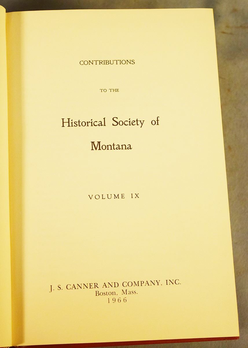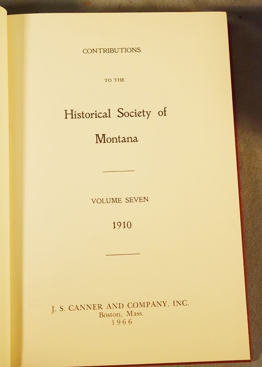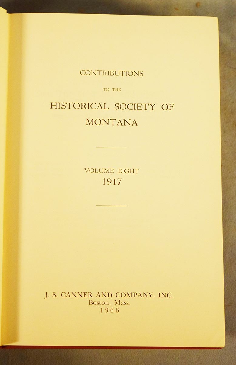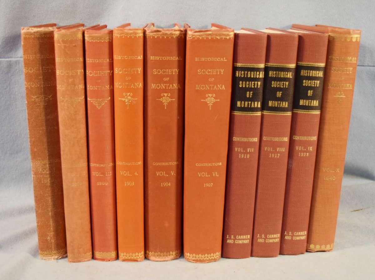 Contributions to the Historical Society of Montana Volumes 1-10, 1876-1910, Volumes 1-6 & 10 are 1st's, Vol 1 by Rocky Mountain Publishing Company, Helena, MT; Vol 2-3 by State Publishing Company, Helena, MT; Vol 4-6 by Independent Publishing Company, Helena, MT; Volume 10 is by Naegele Printing Co., Helena, MT; Vol 7-9 are 2nd's by J. S. Canner and Company Inc, Boston, Mass, 1966