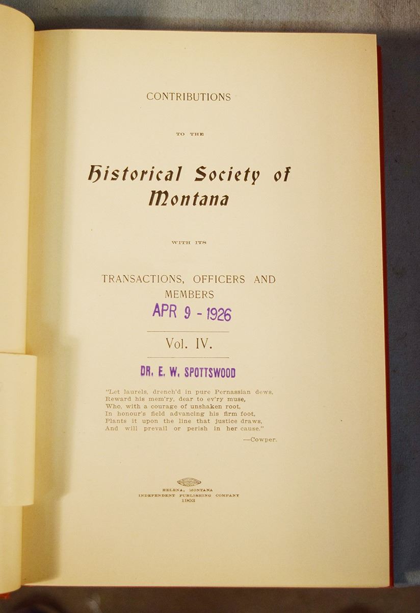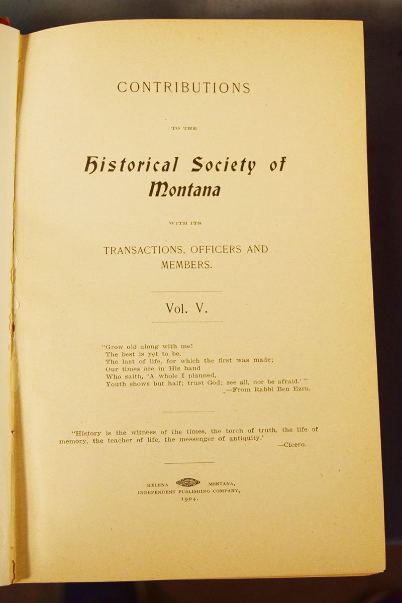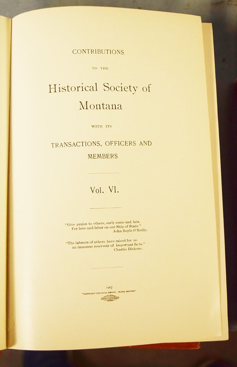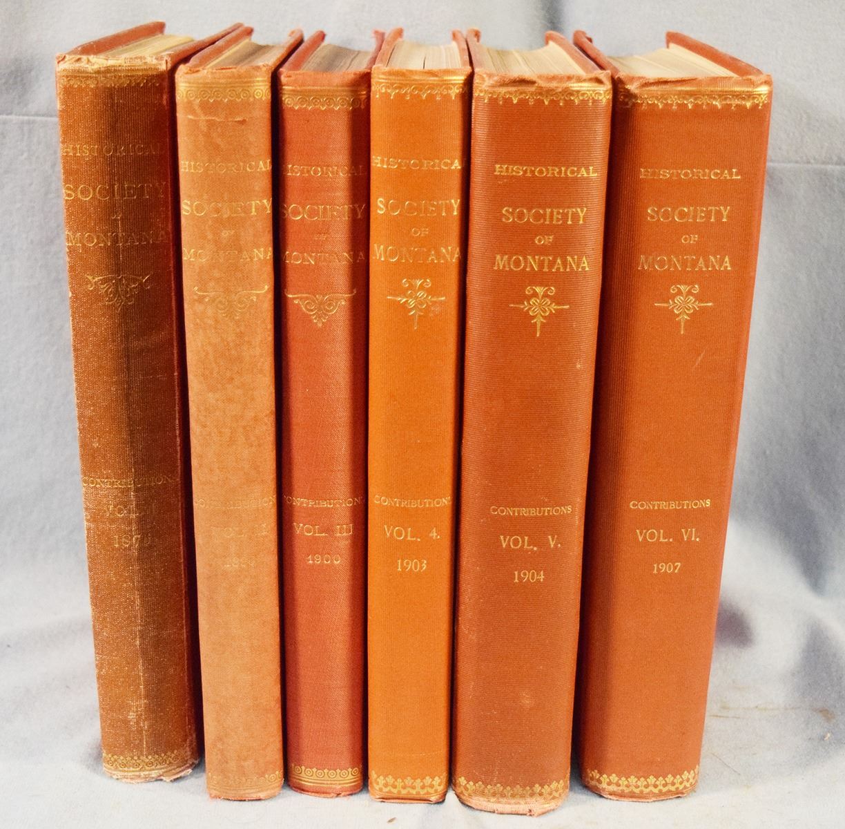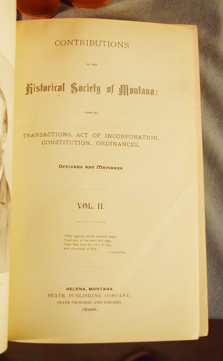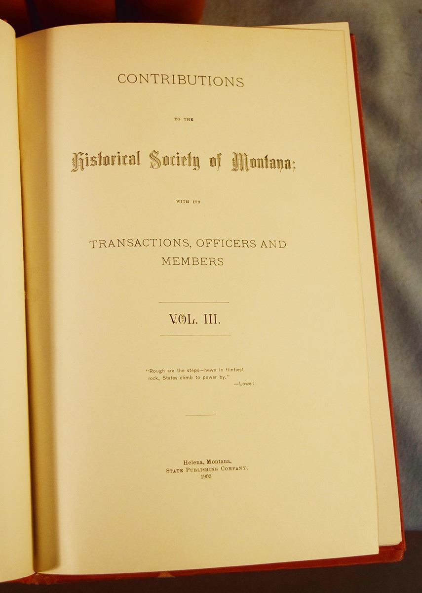 Contributions to the Historical Society of Montana Volumes 1-10, 1876-1910, Volumes 1-6 & 10 are 1st's, Vol 1 by Rocky Mountain Publishing Company, Helena, MT; Vol 2-3 by State Publishing Company, Helena, MT; Vol 4-6 by Independent Publishing Company, Helena, MT; Volume 10 is by Naegele Printing Co., Helena, MT; Vol 7-9 are 2nd's by J. S. Canner and Company Inc, Boston, Mass, 1966