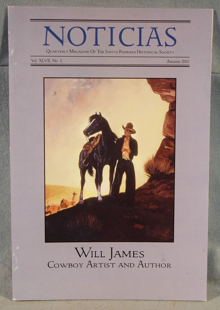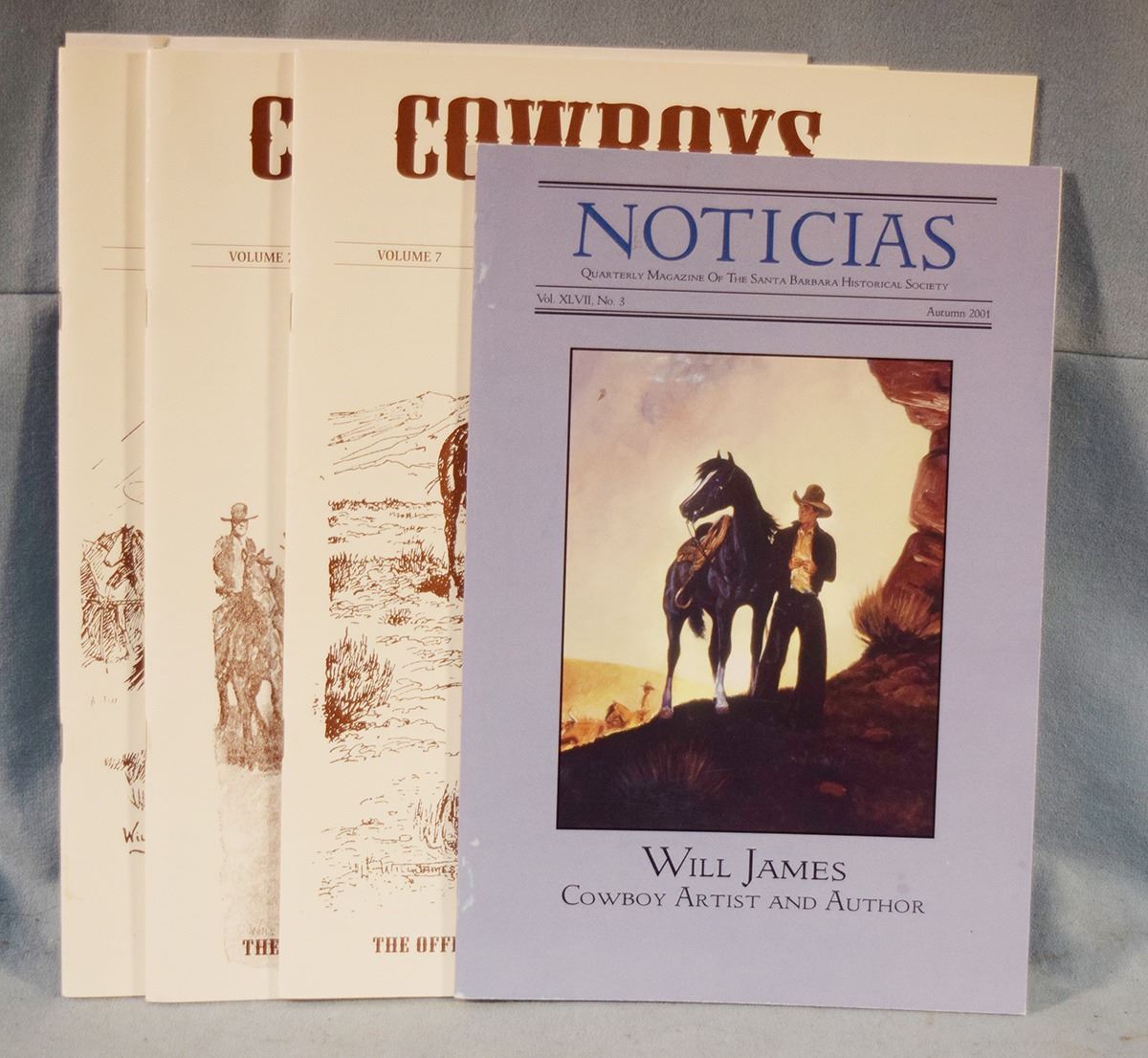 4 pcs: (3) issues Cowboys North & South - Official Publication of the Will James Society, Vol 7, No 1 Spring 1999, Summer 1999 & Fall 199 and Noticias - Quarterly Magazine of the Sanata Barbara Historical Society featuring Will James Cowboy Artist & Author, Autumn 2001