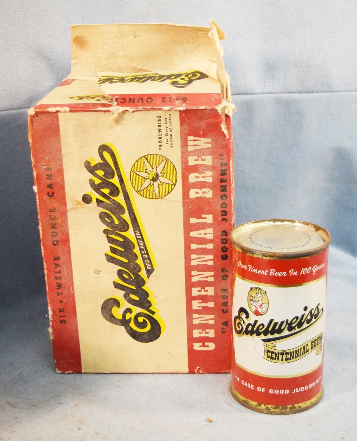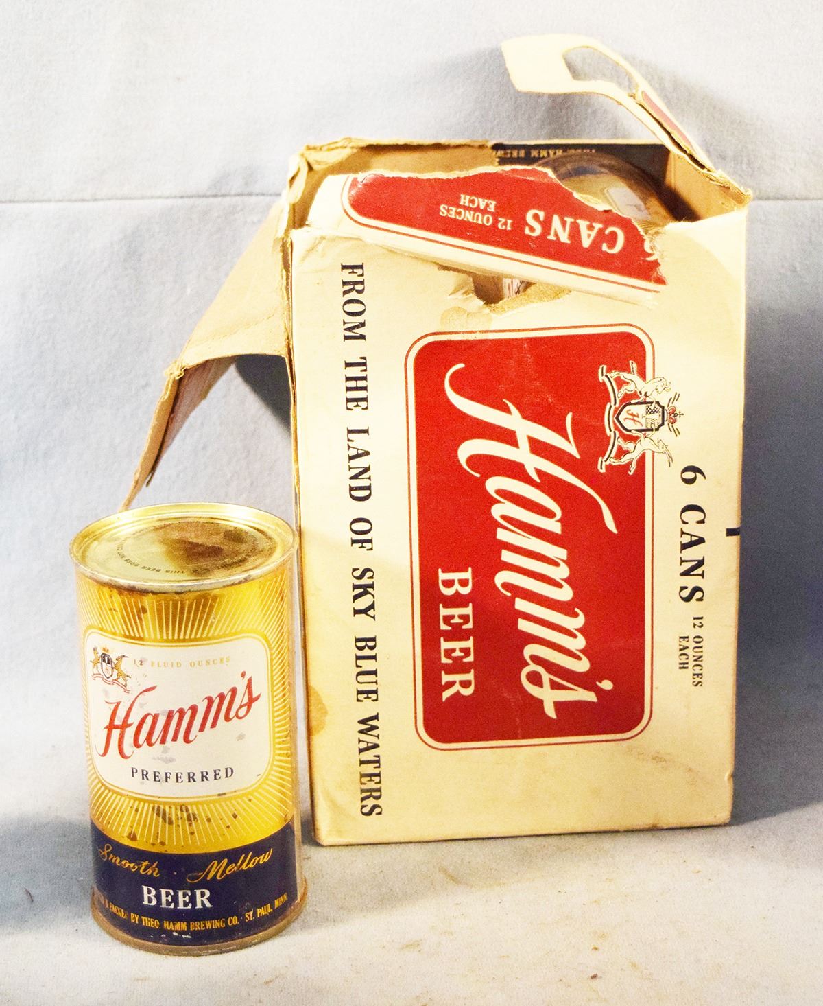 Vintage beer cans: 6 pack of Hamms, 6 pack of Edelweiss, (2) Budweiser & (1) Great Falls Select