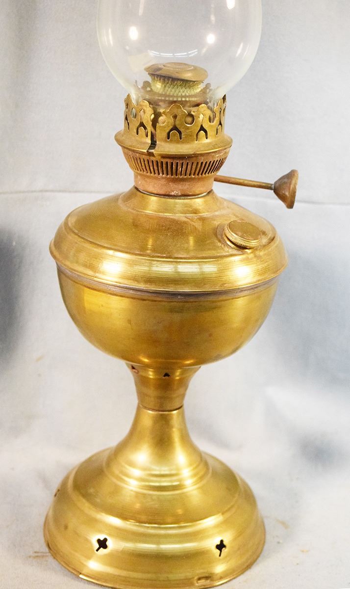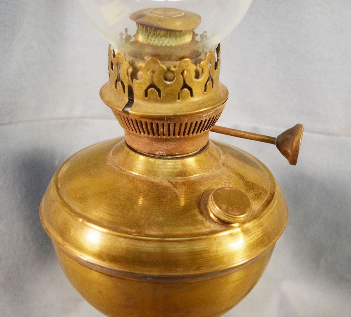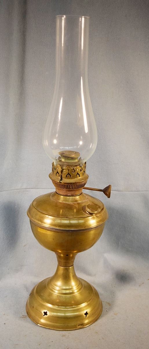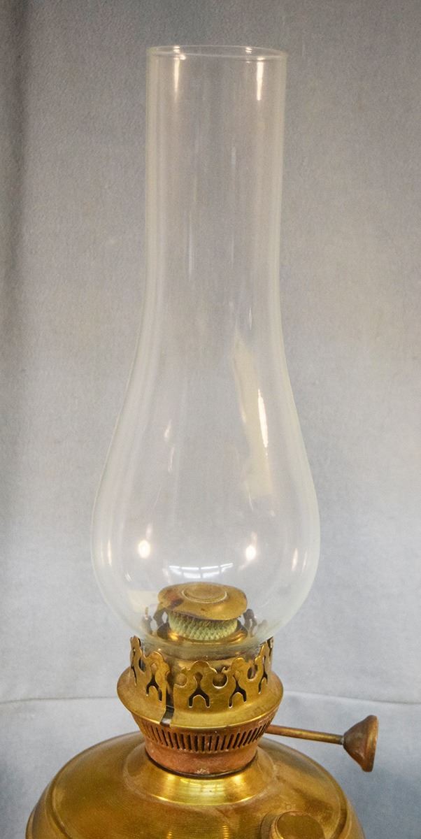 Brass kerosene lamp, lamp 11", chimney 10", total 20.5" tall, 6" base diameter