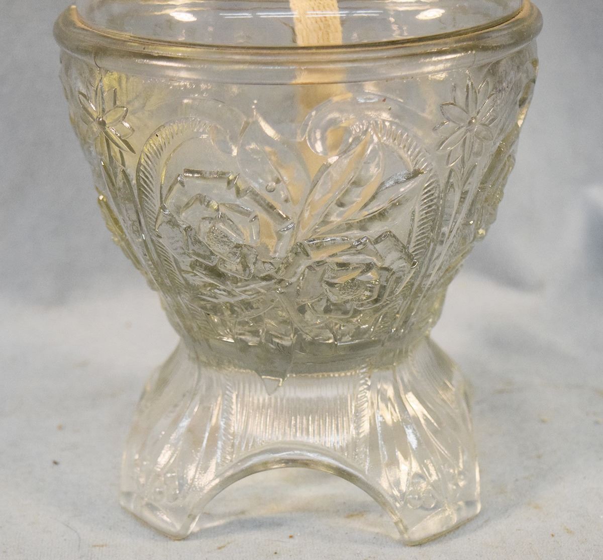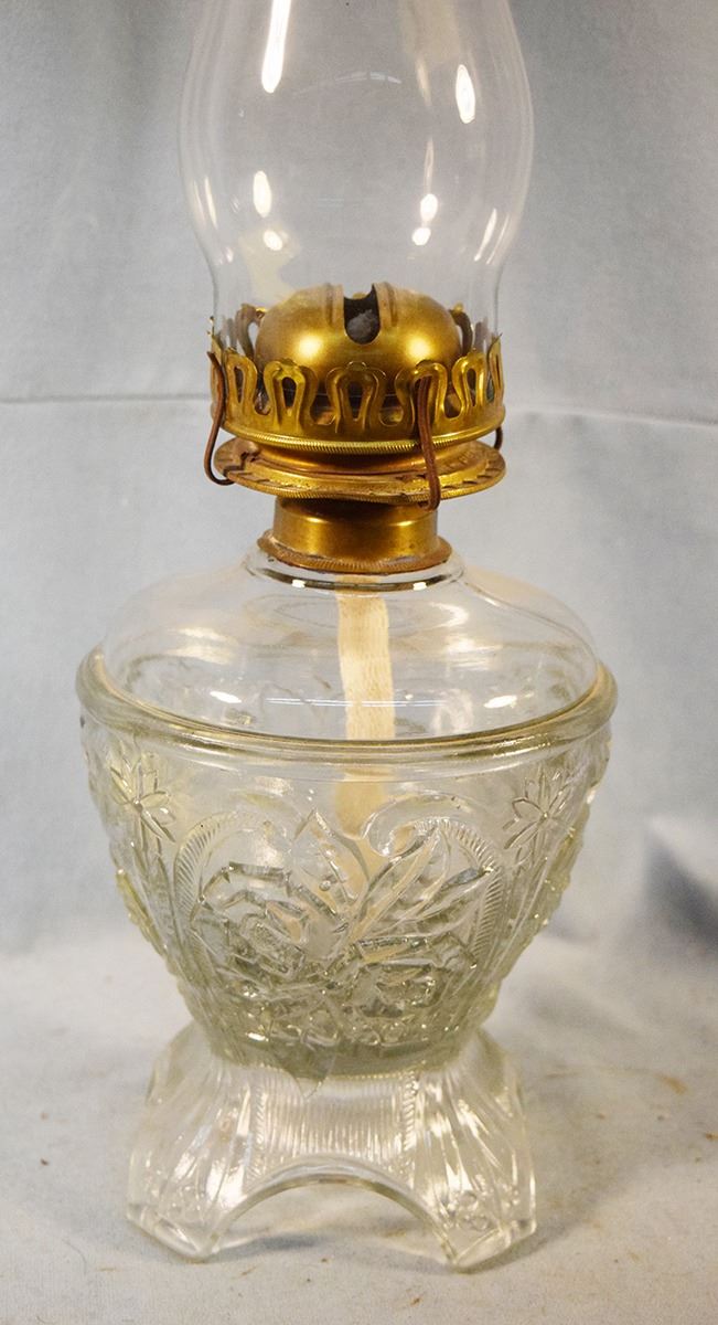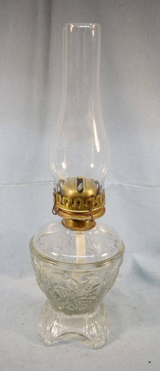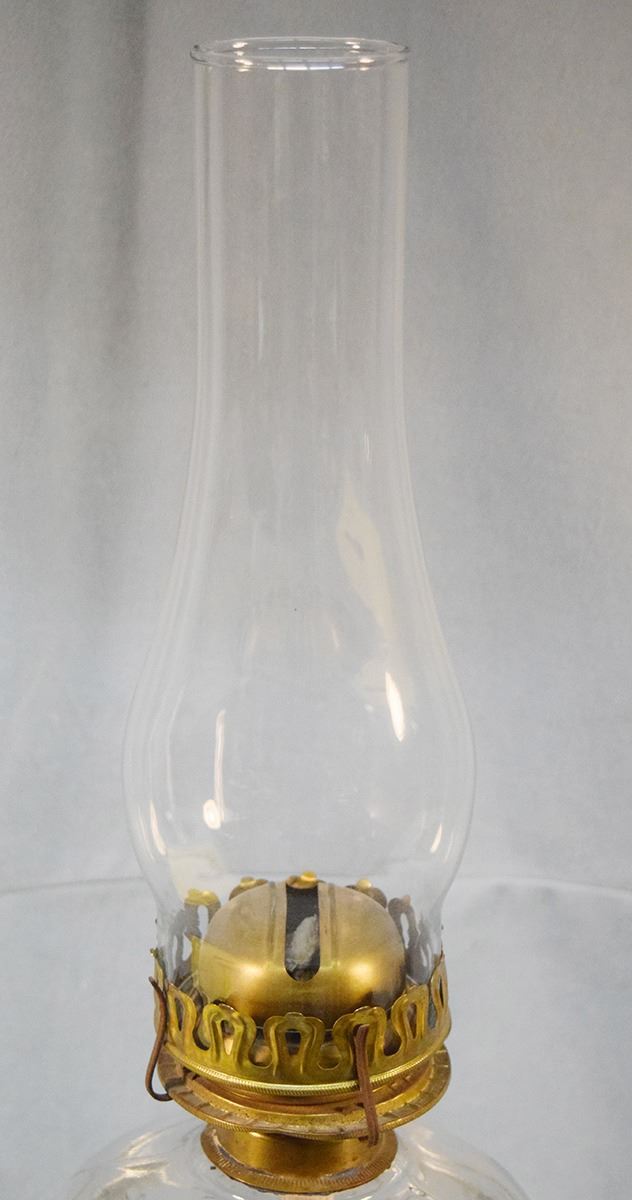 Cut glass kerosene lamp, lamp 10", chimney 10", total 19" tall, 4.5" x 4.5" base with 6" center diameter