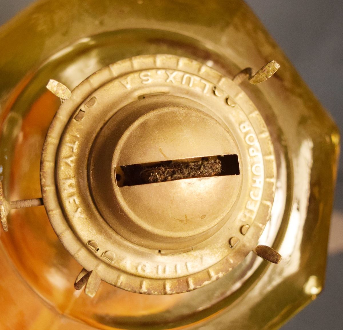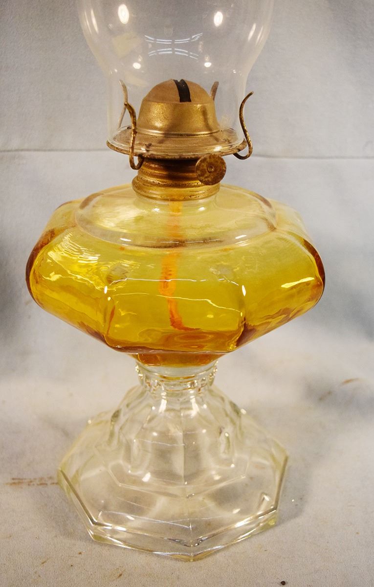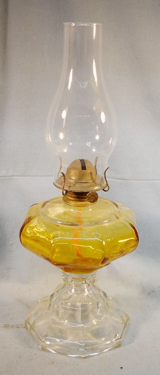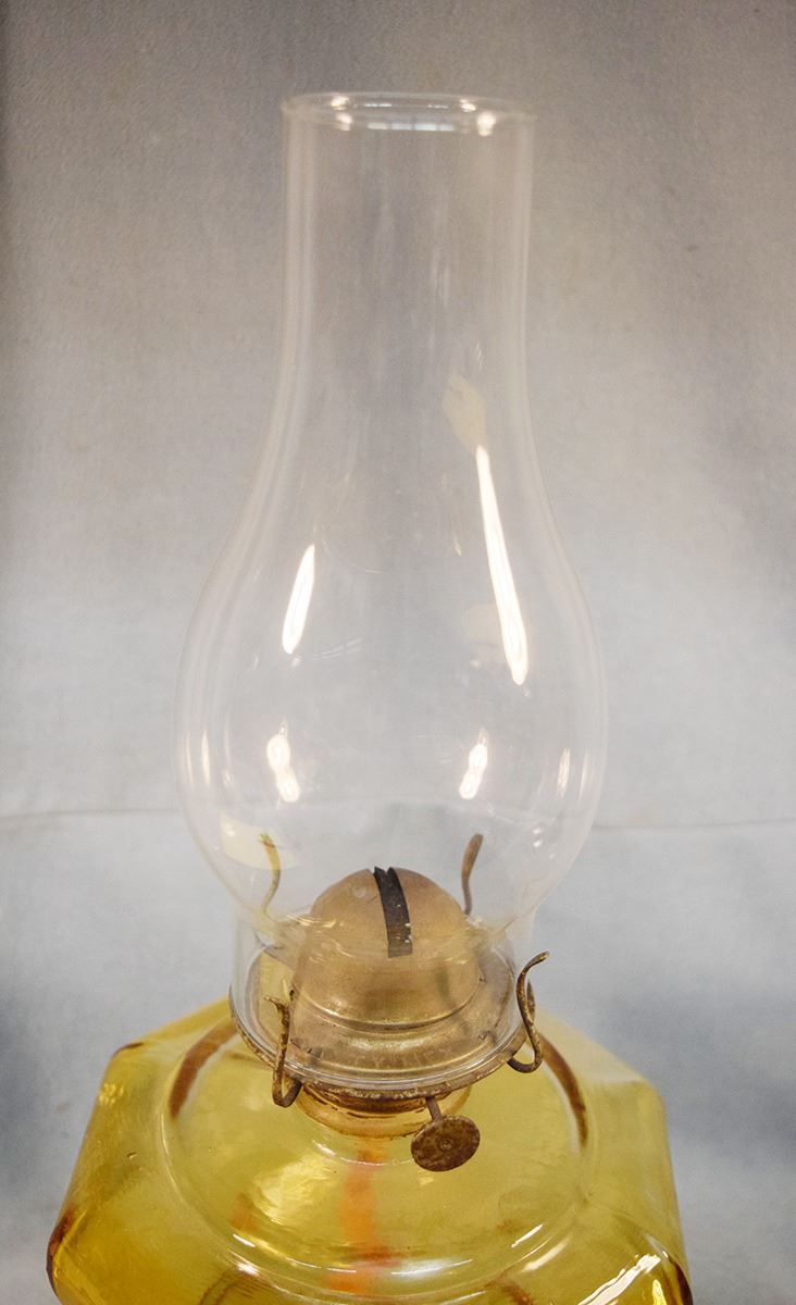 Yellow glass kerosene lamp, lamp 10", chimney 9", total 18" tall, 6" base diameter