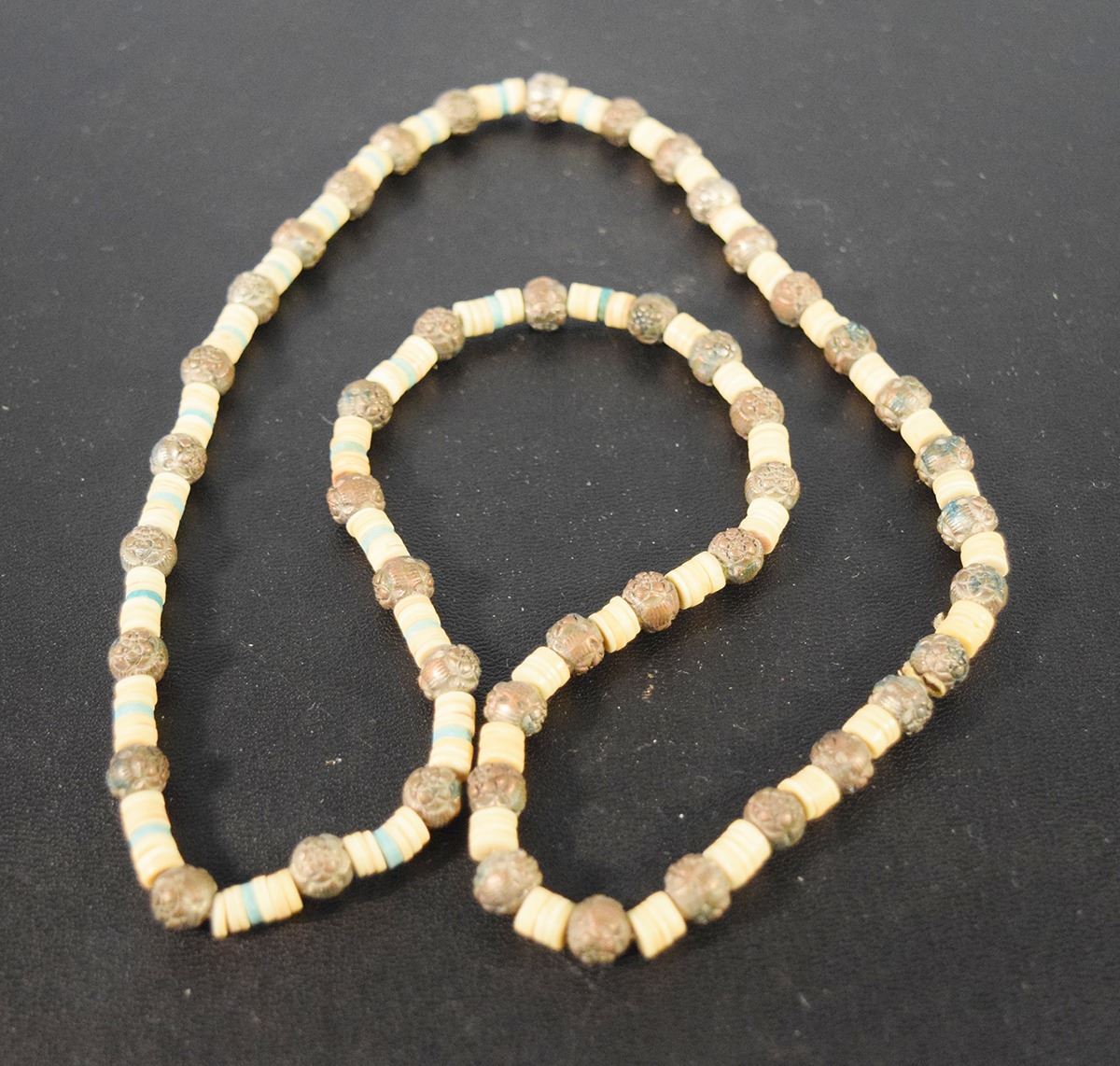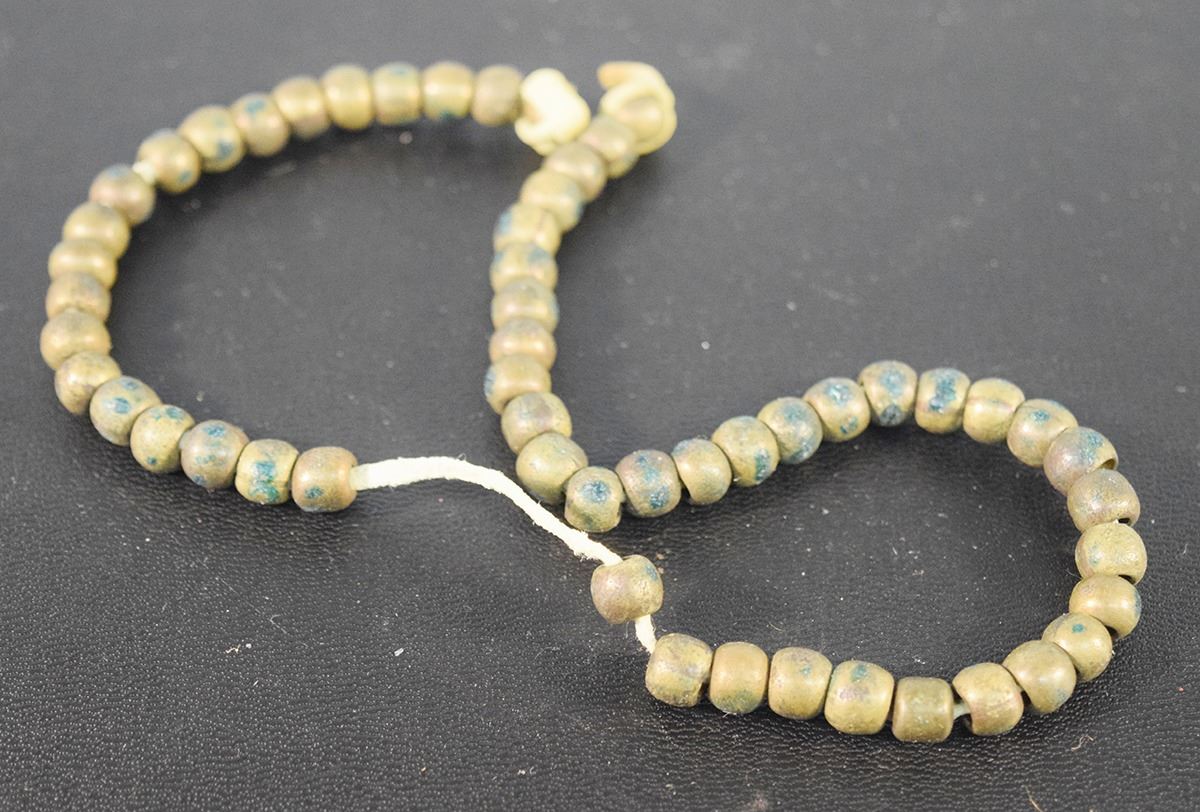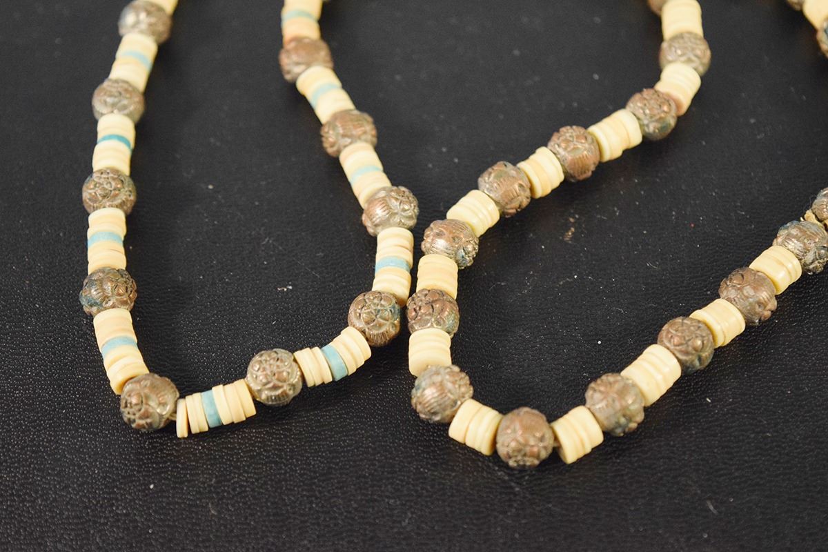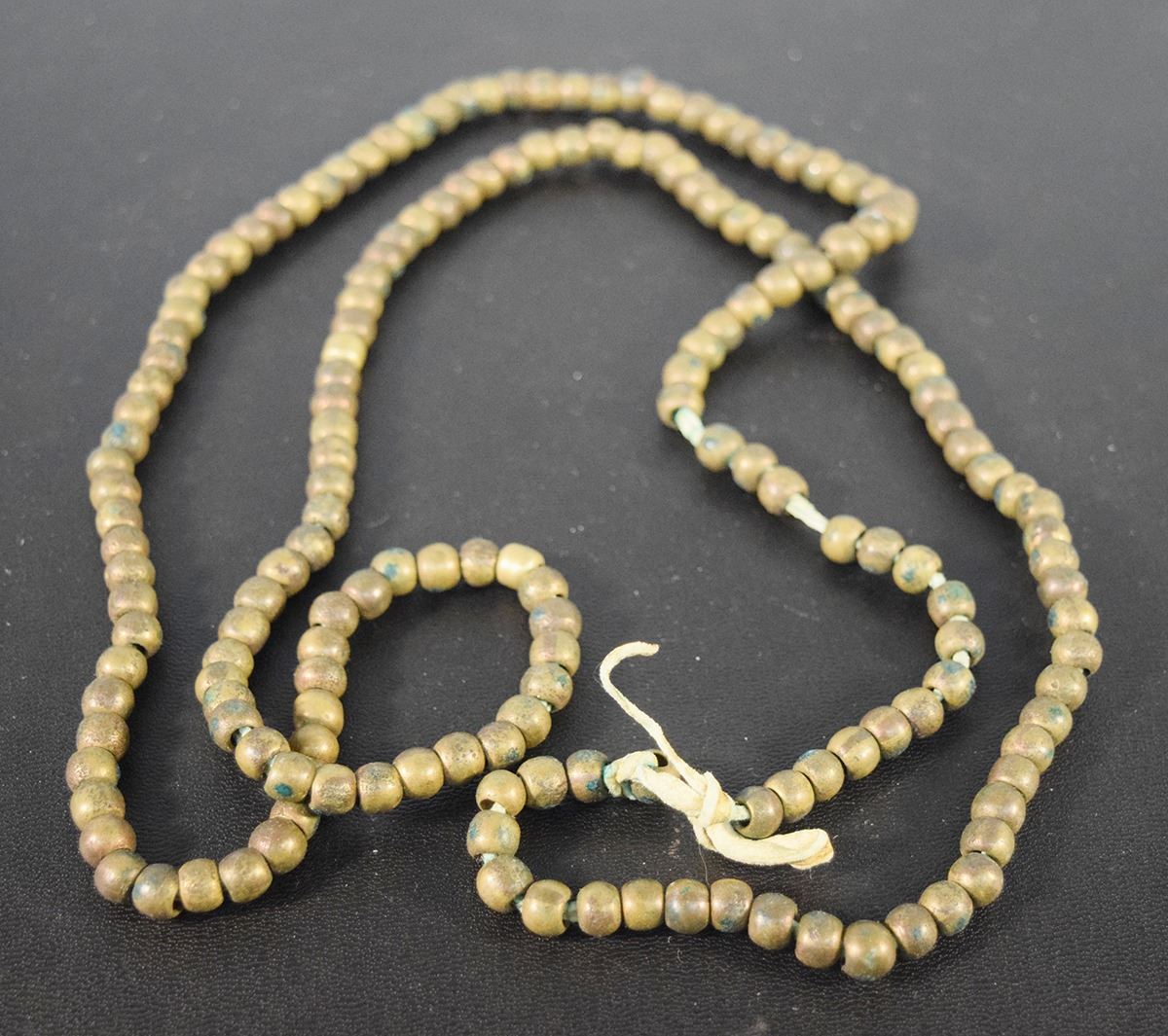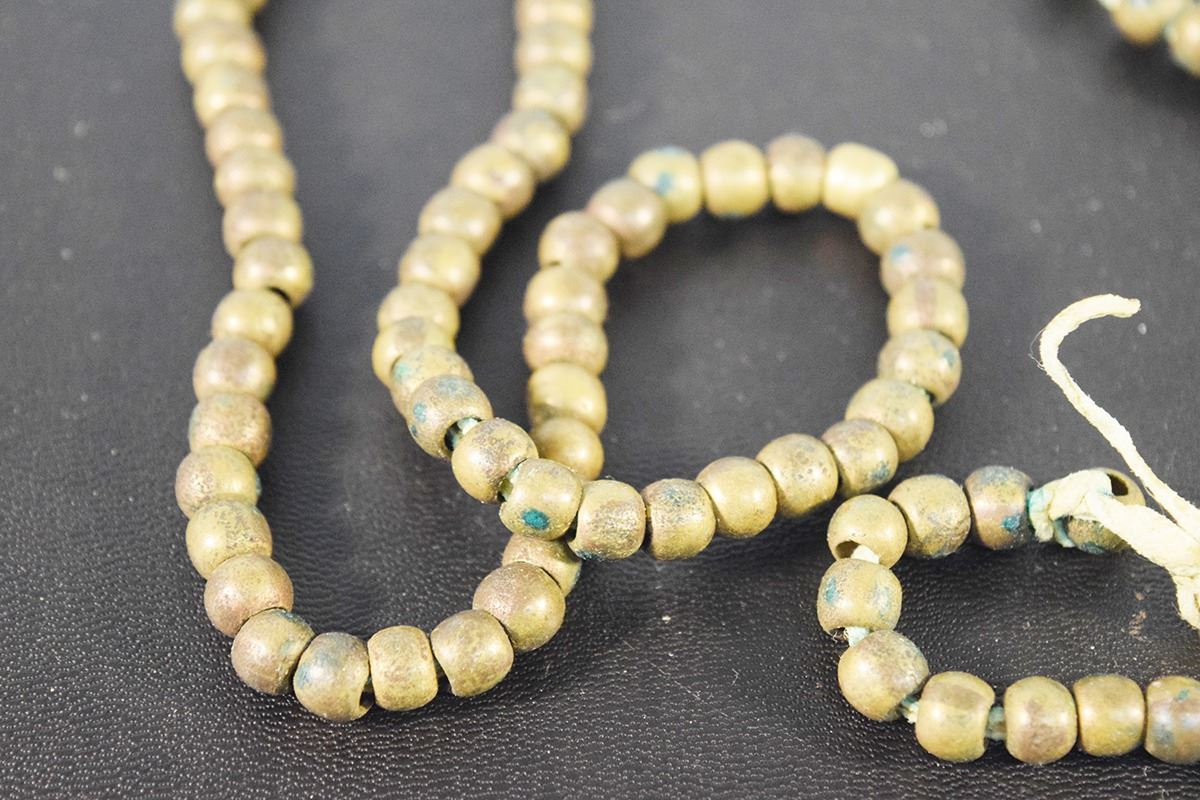 3 pcs: Brass & trade bead necklace; Small strand of brass beads & Brass and possible pucca shells necklace