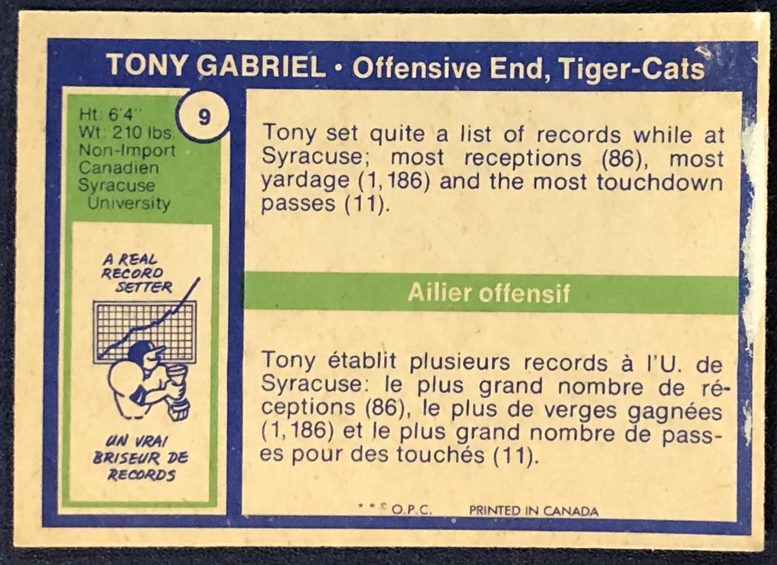 Card #9 OPC, CFL, football, hall of fame