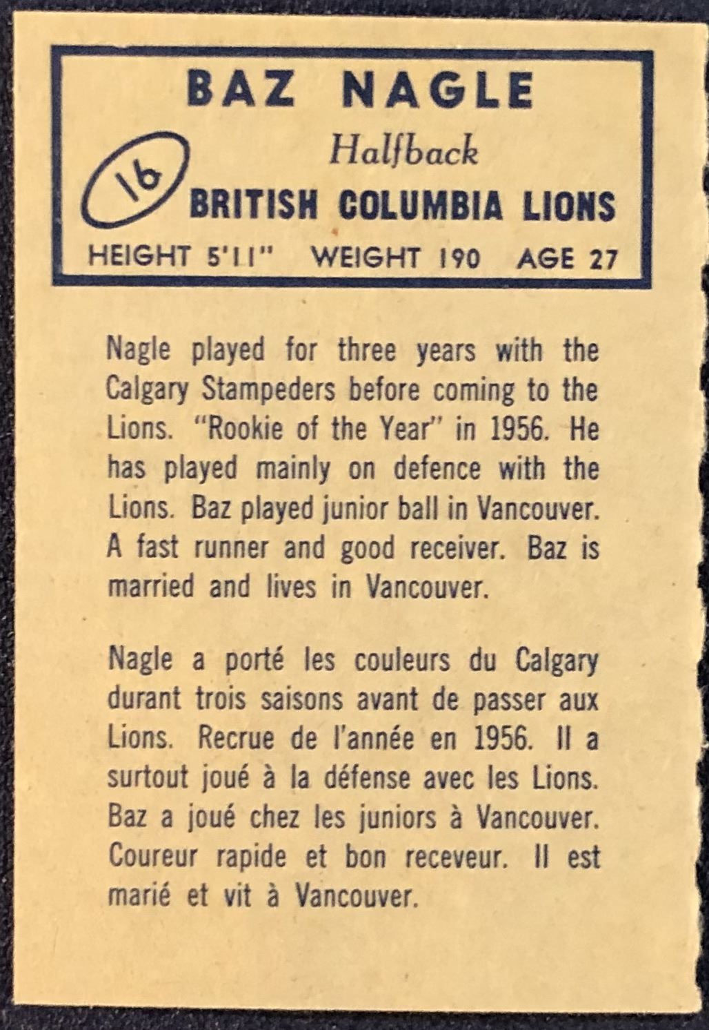 Lot 49 1962 O-PEE-CHEE CFL BAZ NAGLE (HOF)