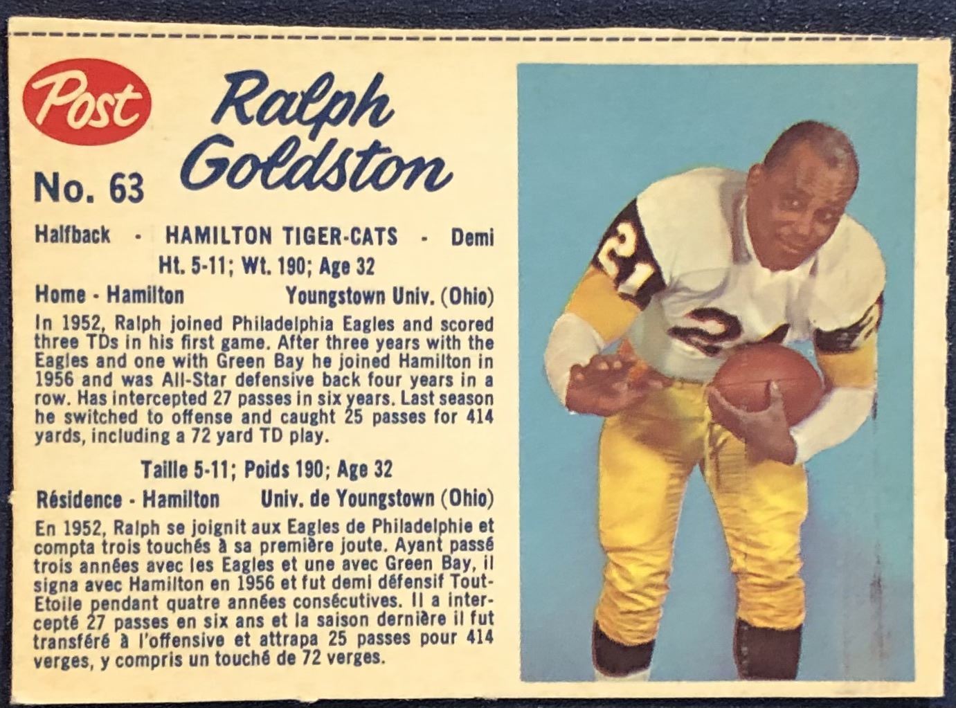 Lot 79 1962 POST CEREAL CFL RALPH GOLDSTON