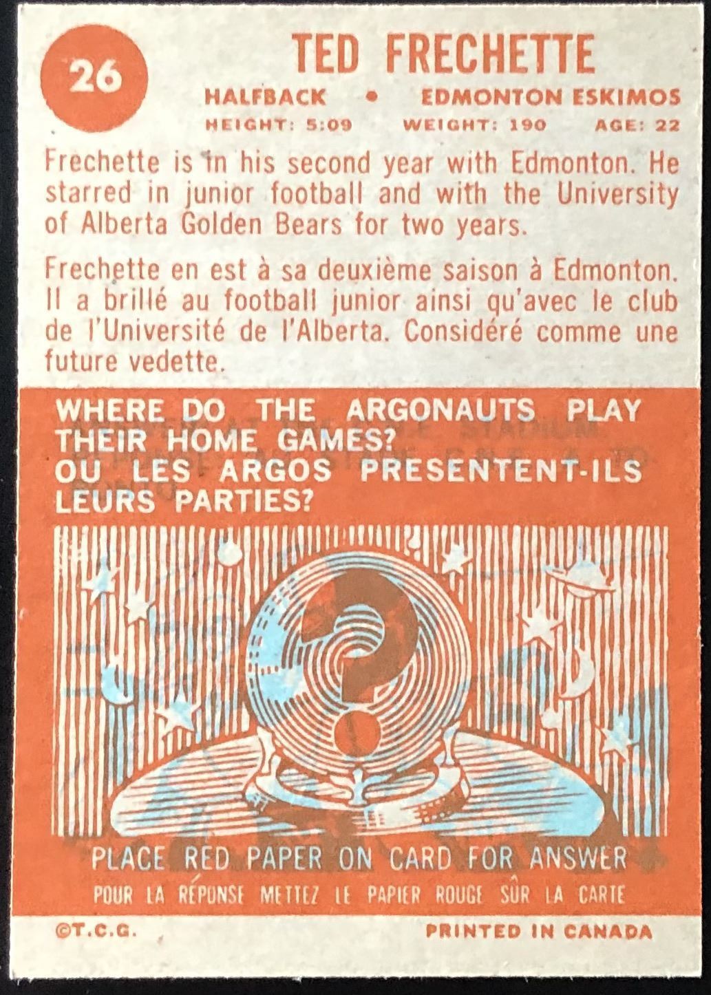 Lot 81 1963 O-PEE-CHEE CFL TED FRECHETTE ROOKIE CARD