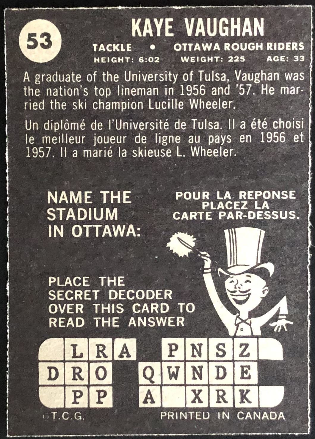 Lot 84 1964 O-PEE-CHEE CFL KAYE VAUGHN (HOF)