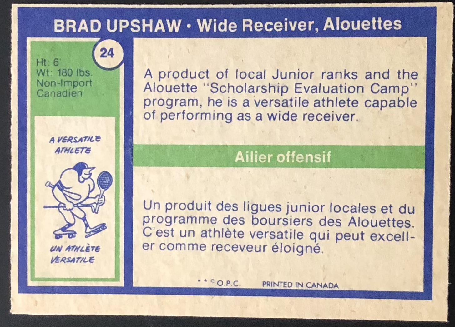 Lot 102 1972 O-PEE-CHEE CFL BRAD UPSHAW ROOKIE CARD