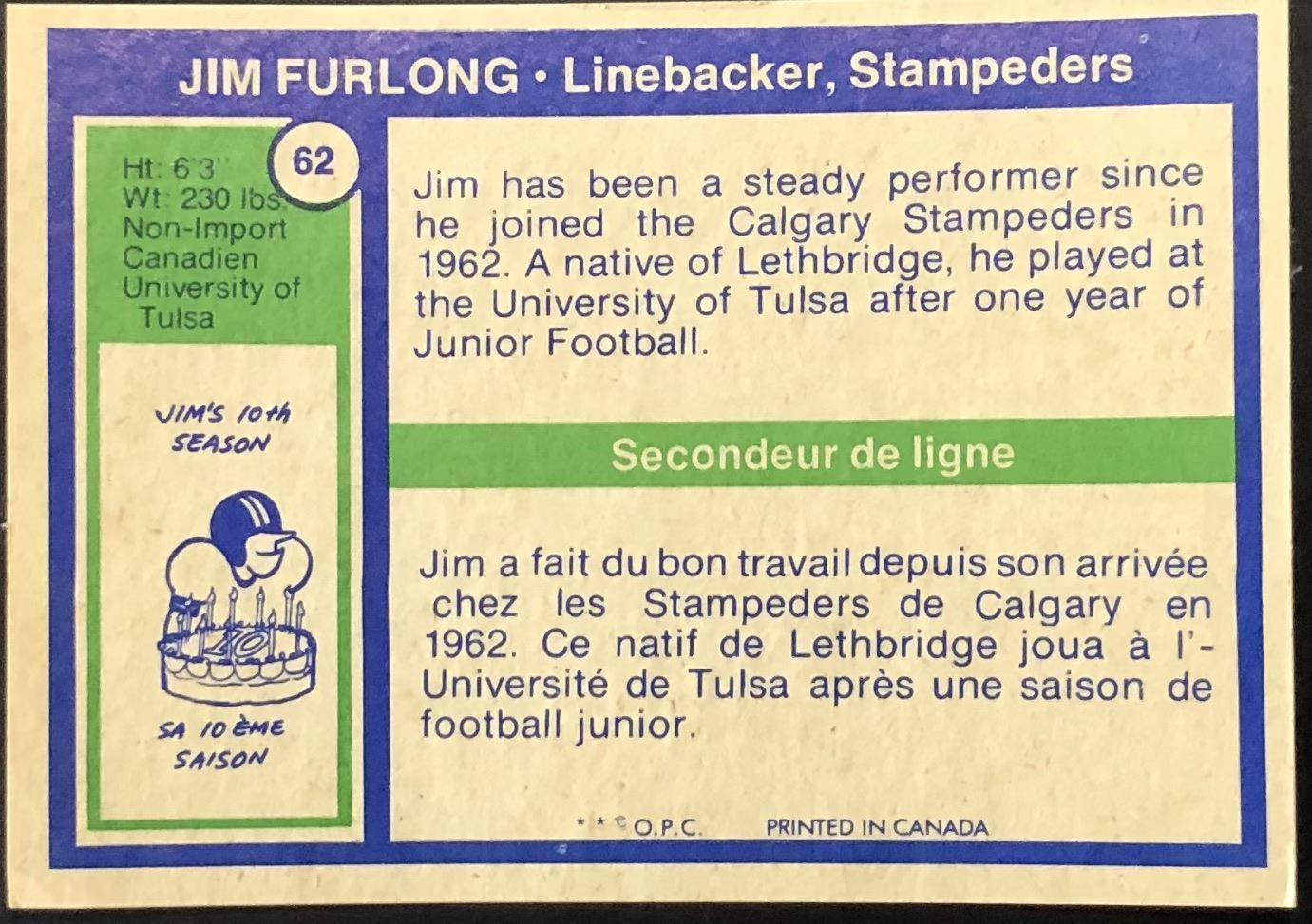 Lot 105 1972 O-PEE-CHEE CFL JIM FURLONG