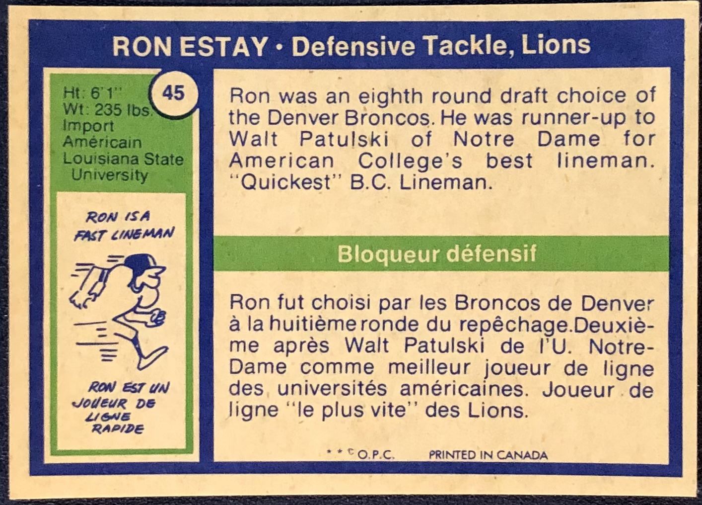Card #45 OPC, CFL, football, hall of fame