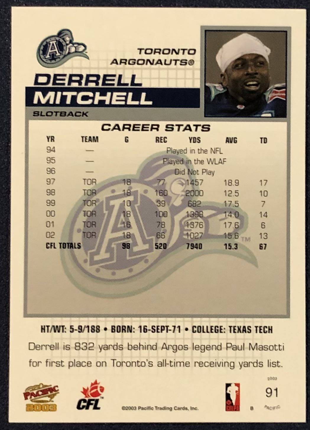 Lot 120 2003 PACIFIC CFL DERRELL MITCHELL (HOF)