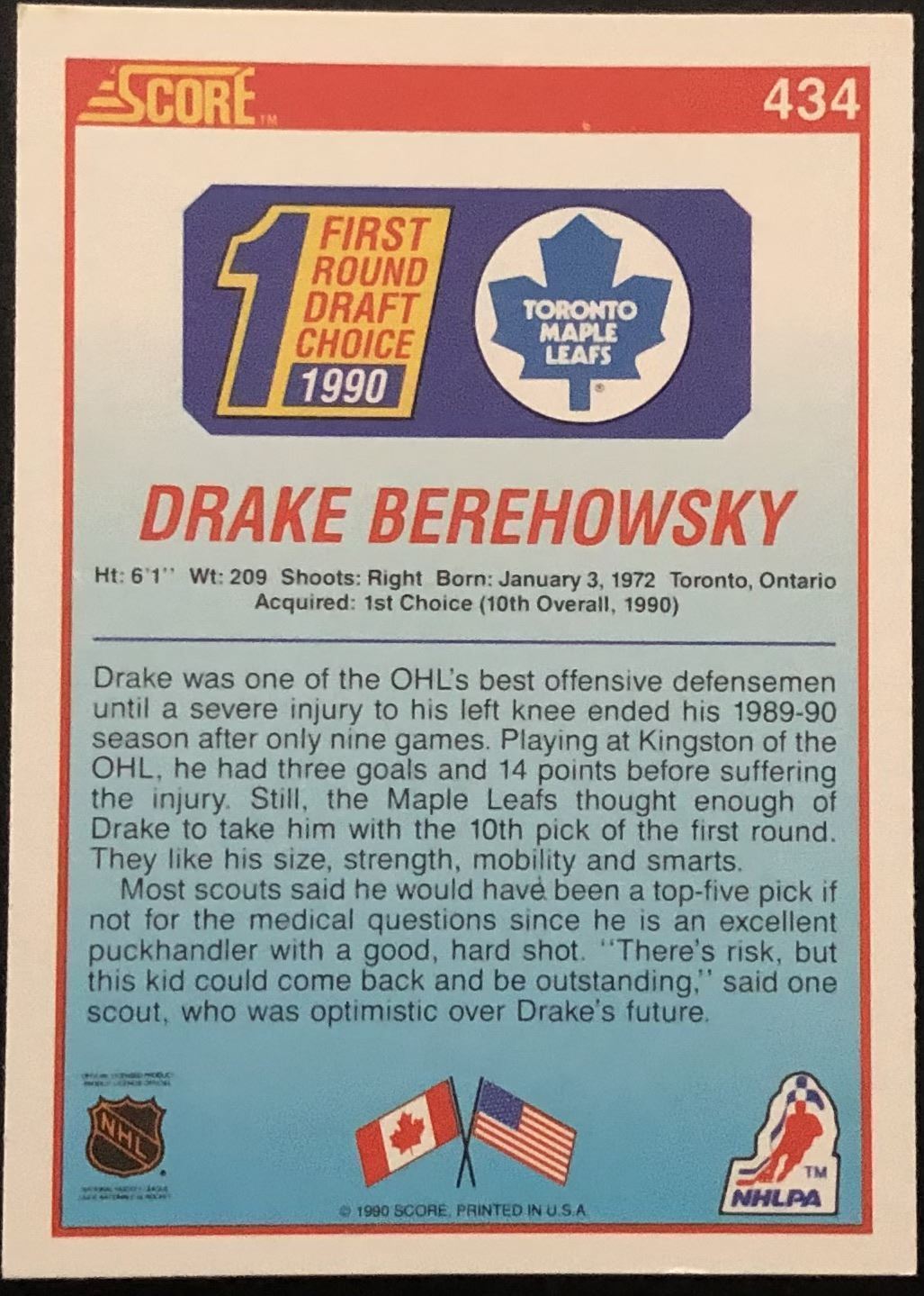 Lot 132 1990-91 SCORE DRAKE BEREHOWSKY ROOKIE CARD