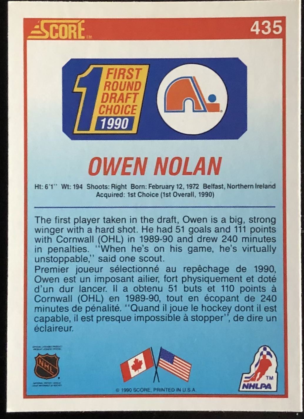 Lot 135 1990-91 SCORE OWEN NOLAN ROOKIE CARD