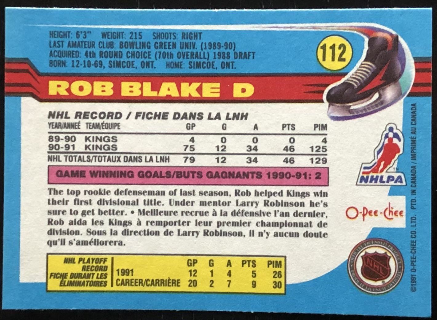 Lot 143 1991-92 O-PEE-CHEE HOCKEY ROB BLAKE (HOF) ROOKIE CARD