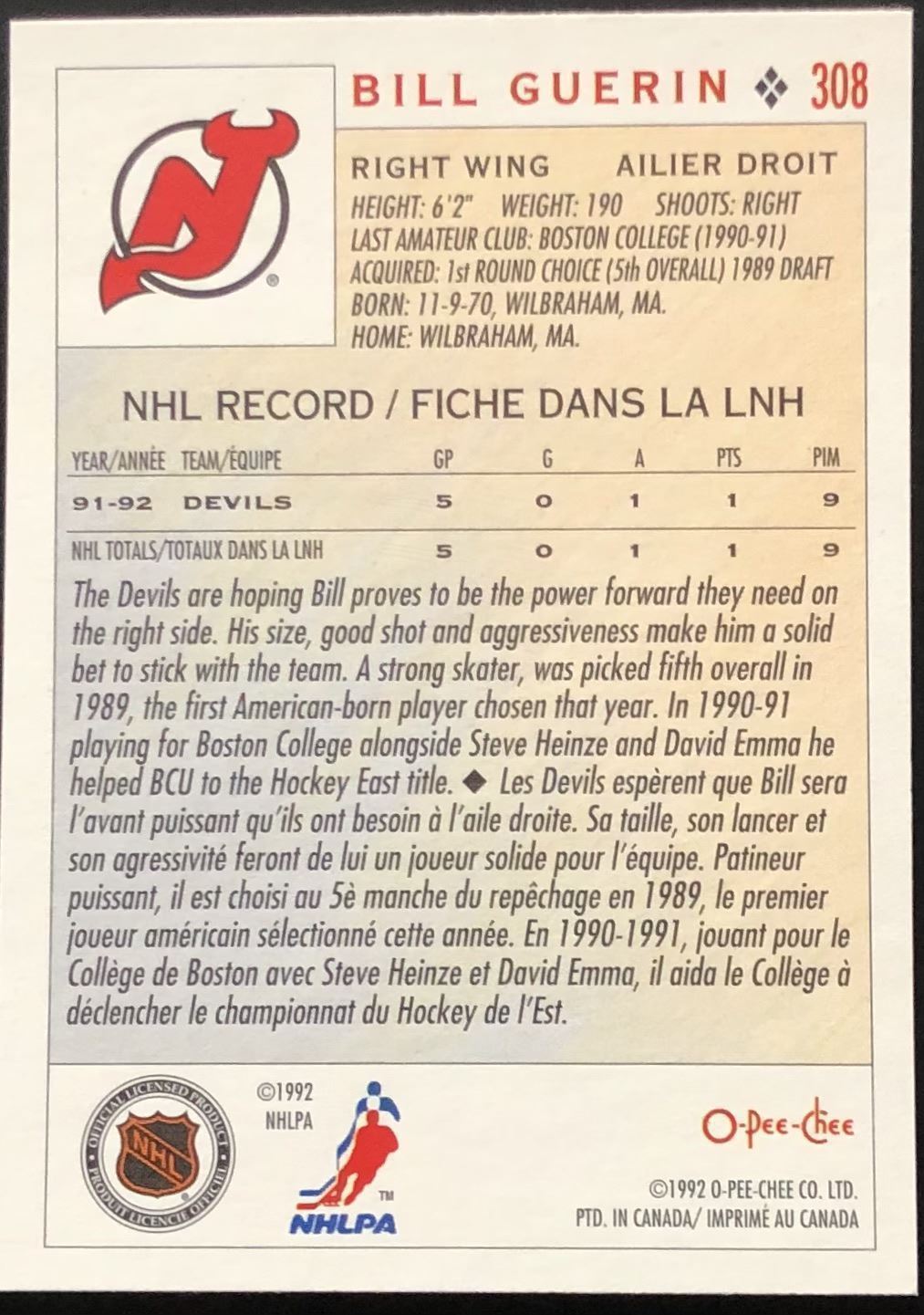 Lot 166 1992-93 O-PEE-CHEE BILL GUERIN ROOKIE CARD
