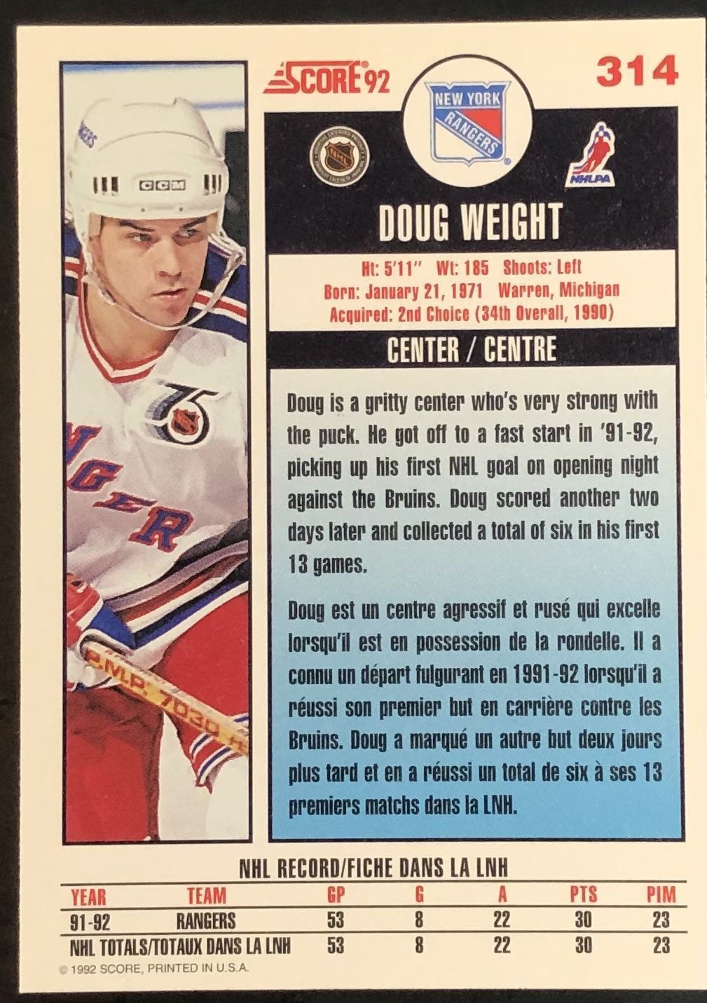 Lot 176 1992-93 SCORE DOUG WEIGHT ROOKIE CARD