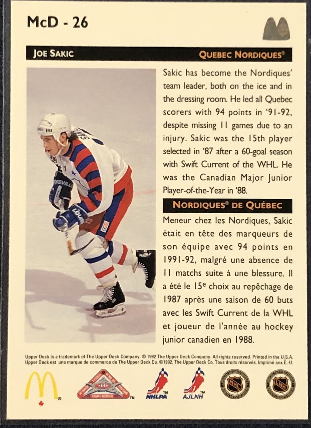 Lot 179 1992-93 UPPER DECK JOE SAKIC (HOF)