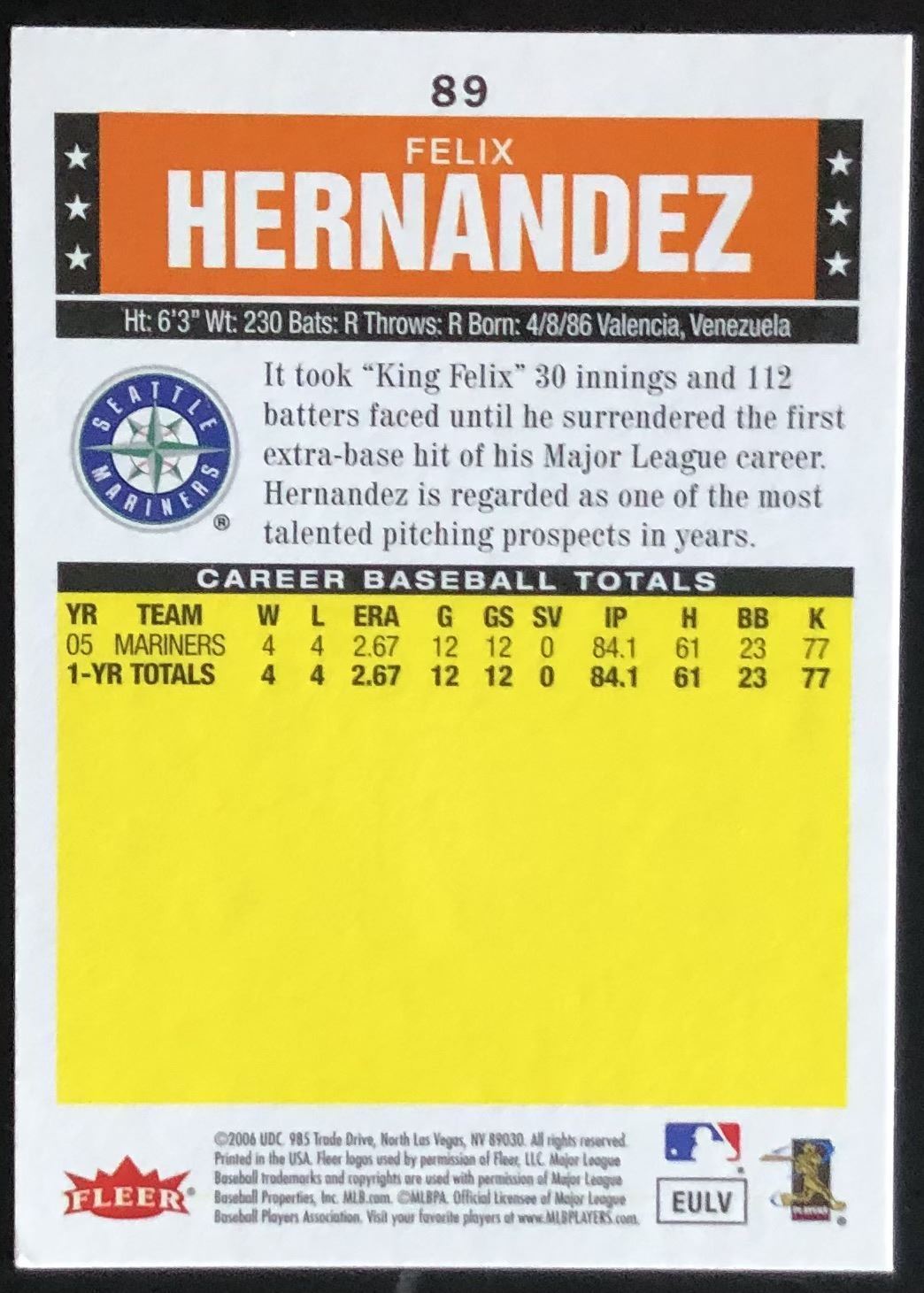 Lot 215 2006 FLEER FELIX HERNANDEZ ROOKIE CARD