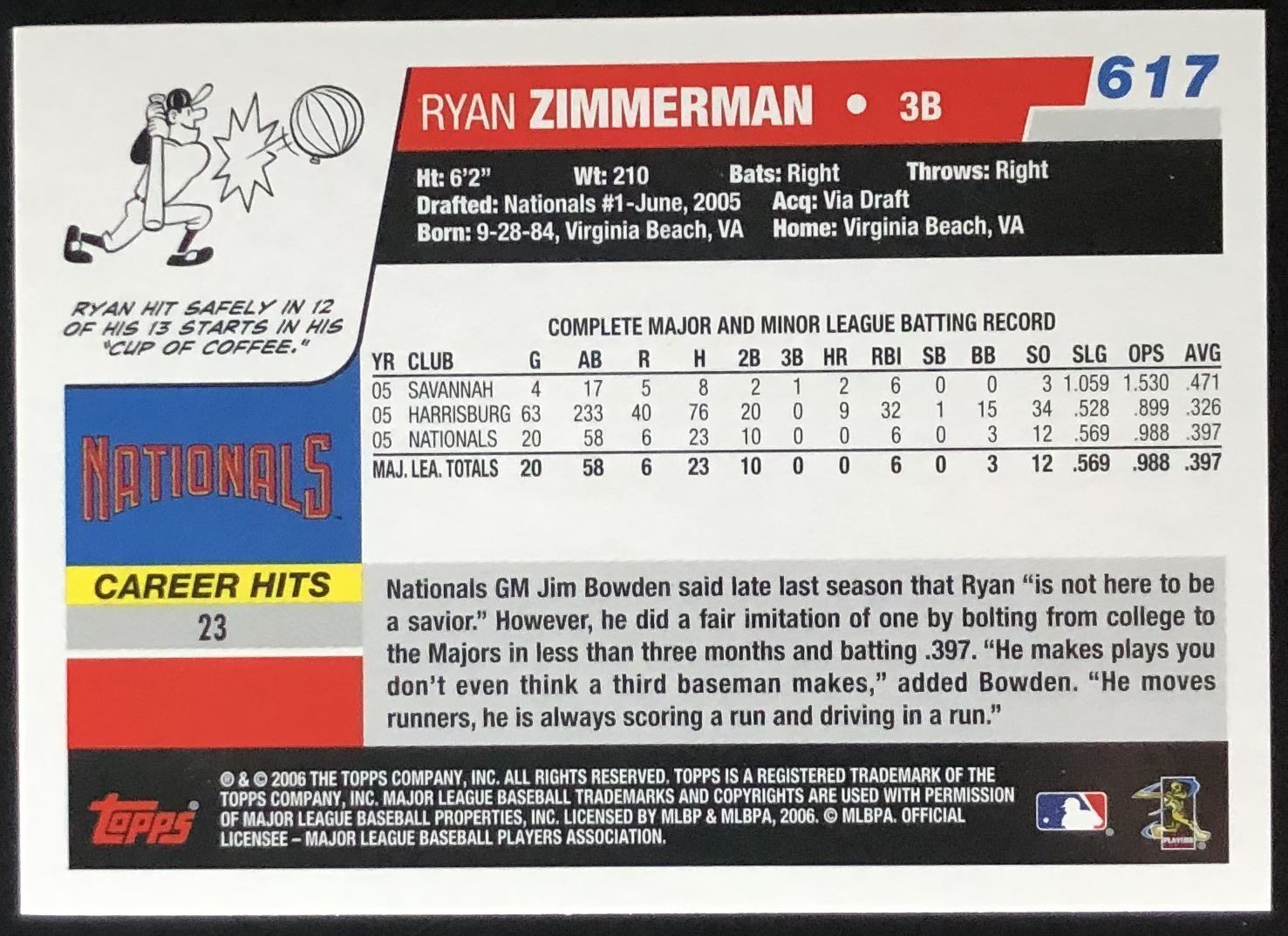 Lot 220 2006 TOPPS RYAN ZIMMERMAN ROOKIE CARD