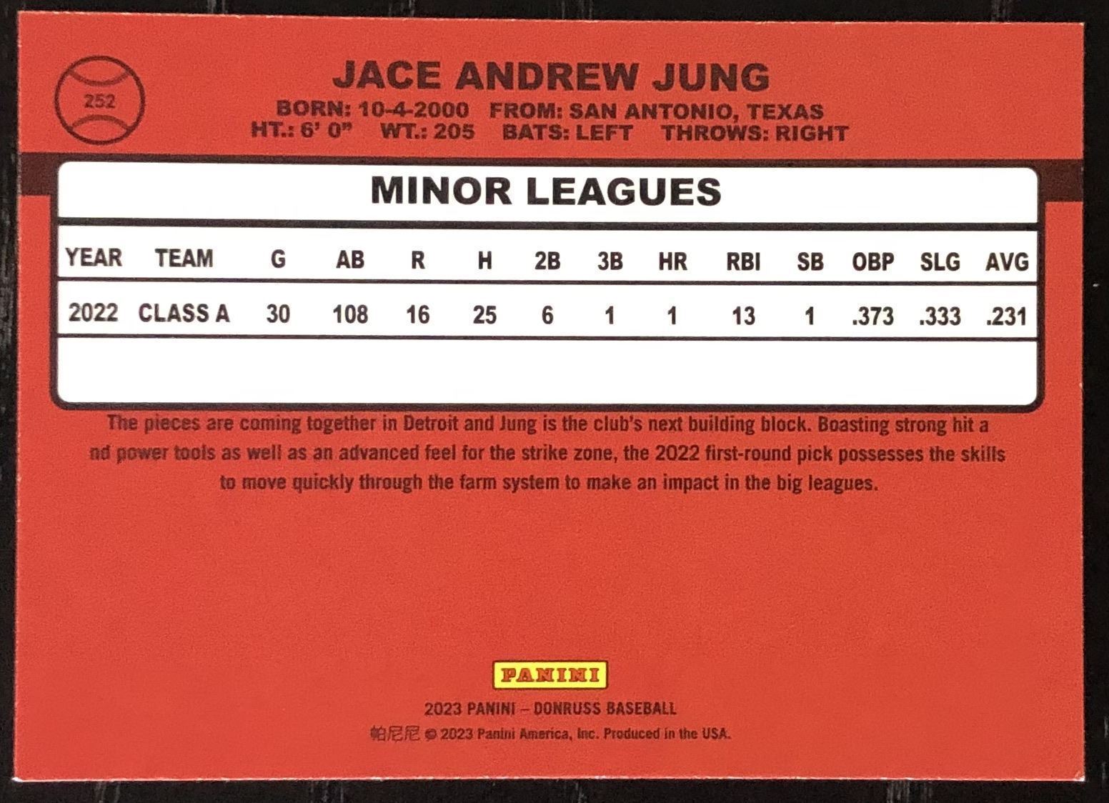 Lot 243 2023 DONRUSS RETRO JACE JUNG ROOKIE CARD