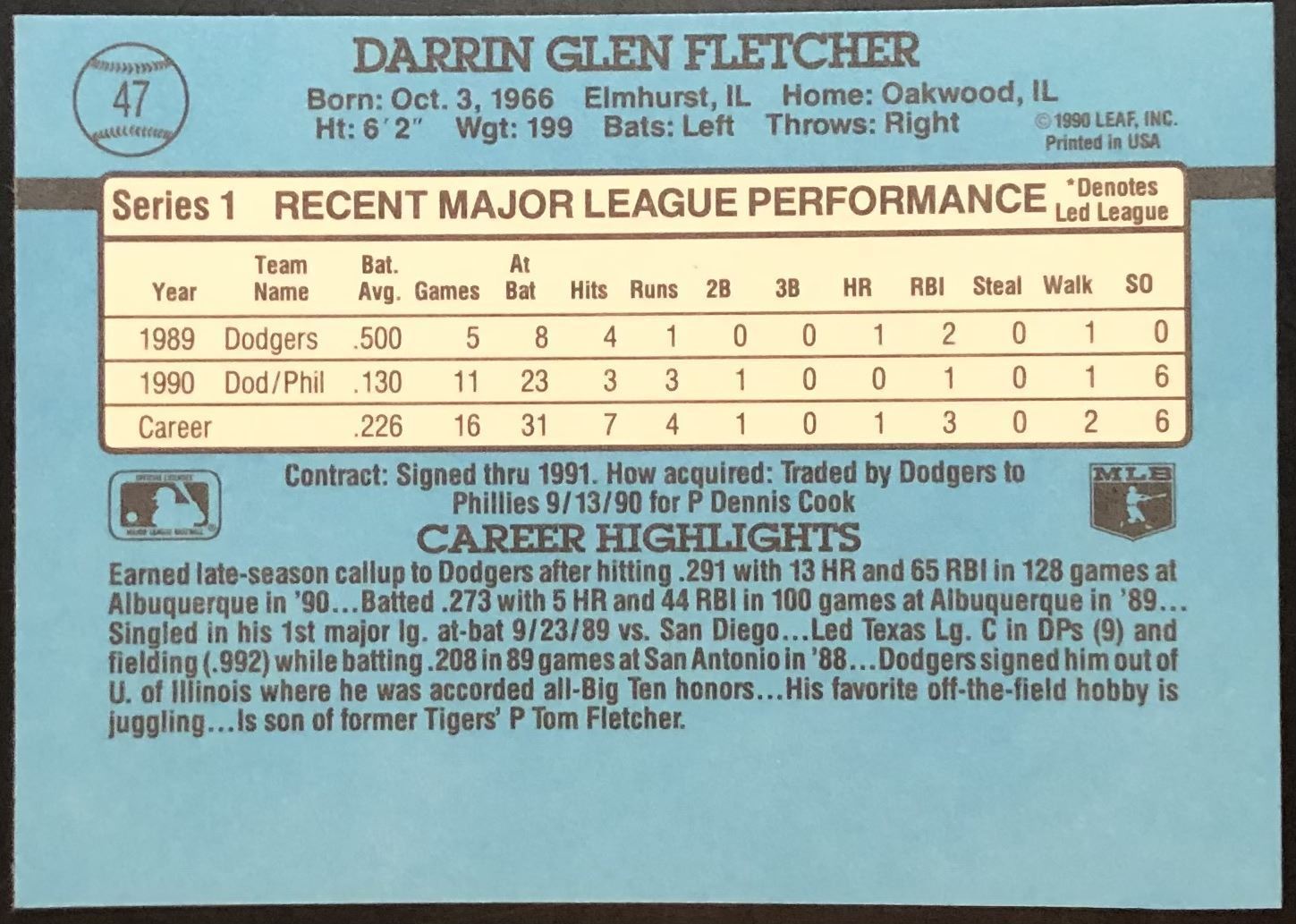 Lot 399 1991 DONRUSS DARRIN FLETCHER ROOKIE CARD
