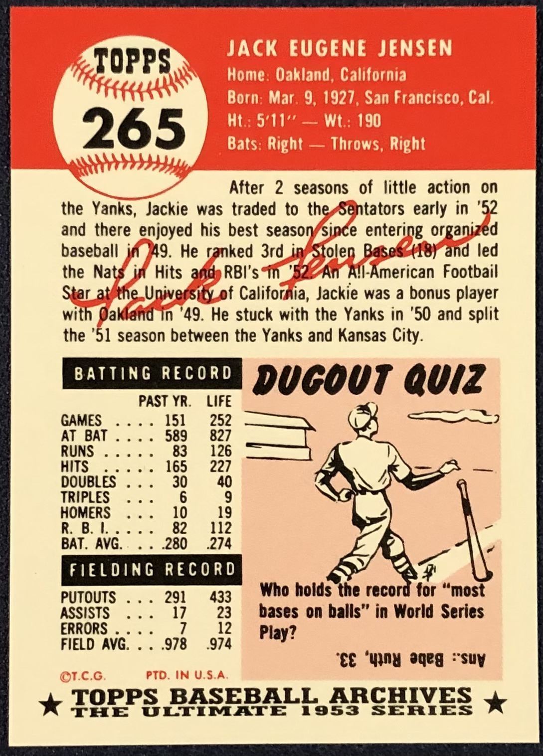 Lot 408 1991 TOPPS ARCHIVES (1953) JACKIE JENSEN