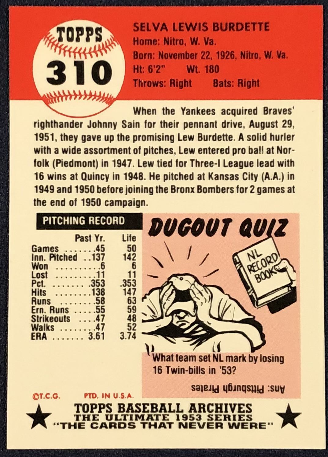 Lot 411 1991 TOPPS ARCHIVES (1953) LEW BURDETTE