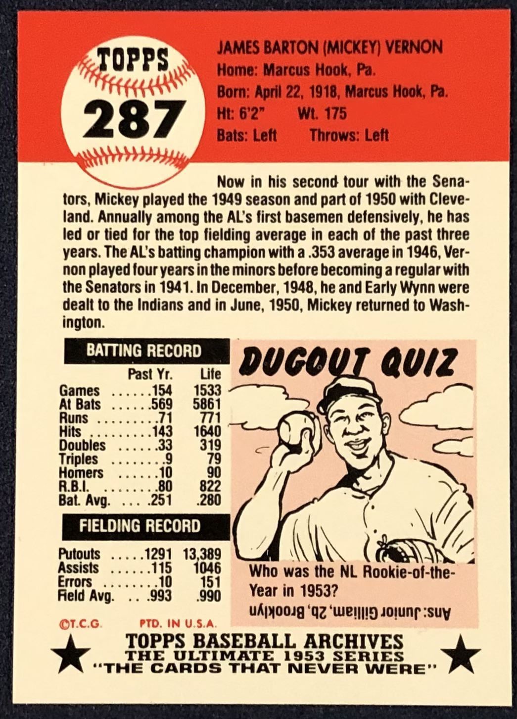 Lot 412 1991 TOPPS ARCHIVES (1953) MICKEY VERNON (HOF)
