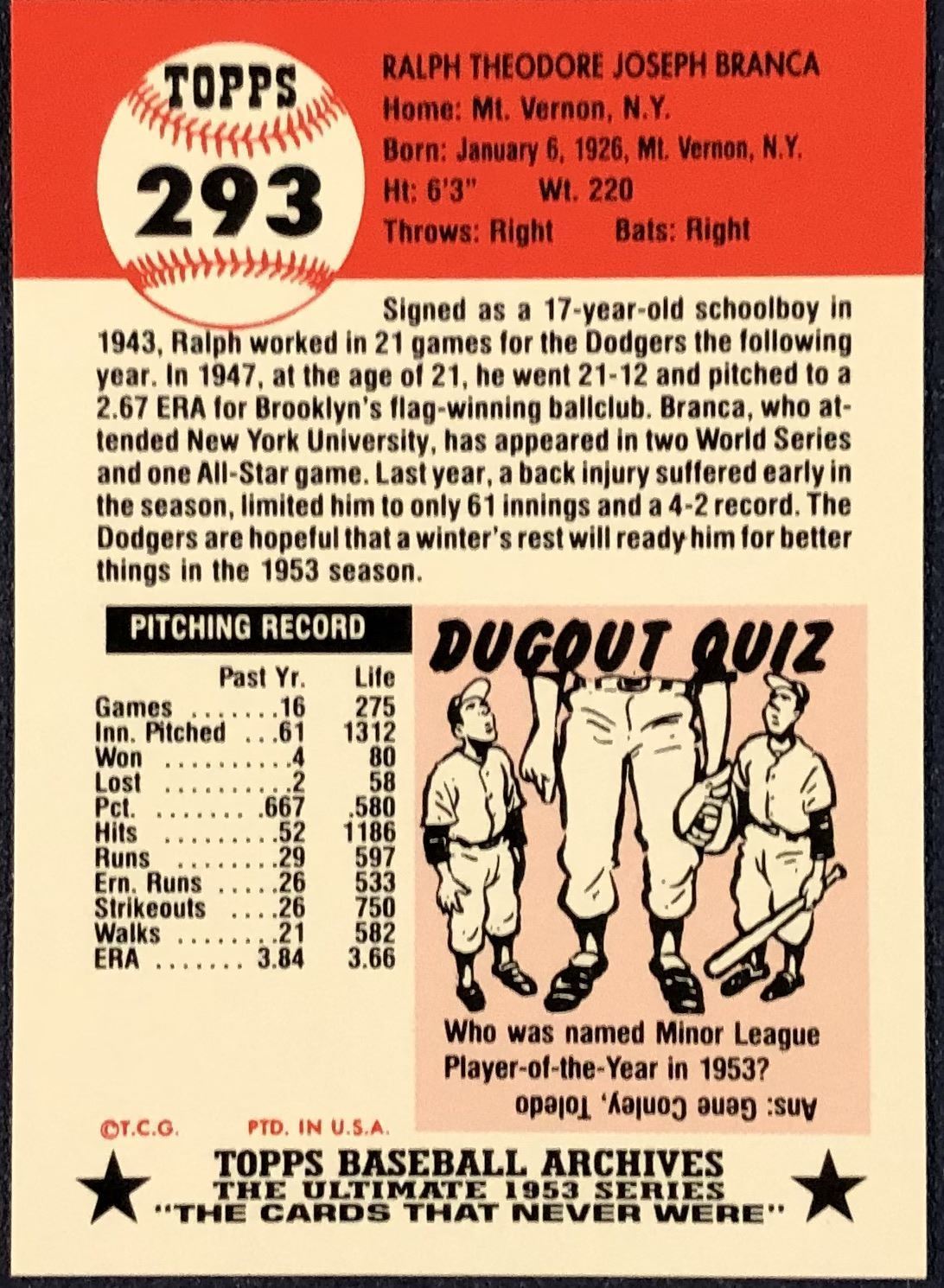 Lot 414 1991 TOPPS ARCHIVES (1953) RALPH BRANCA