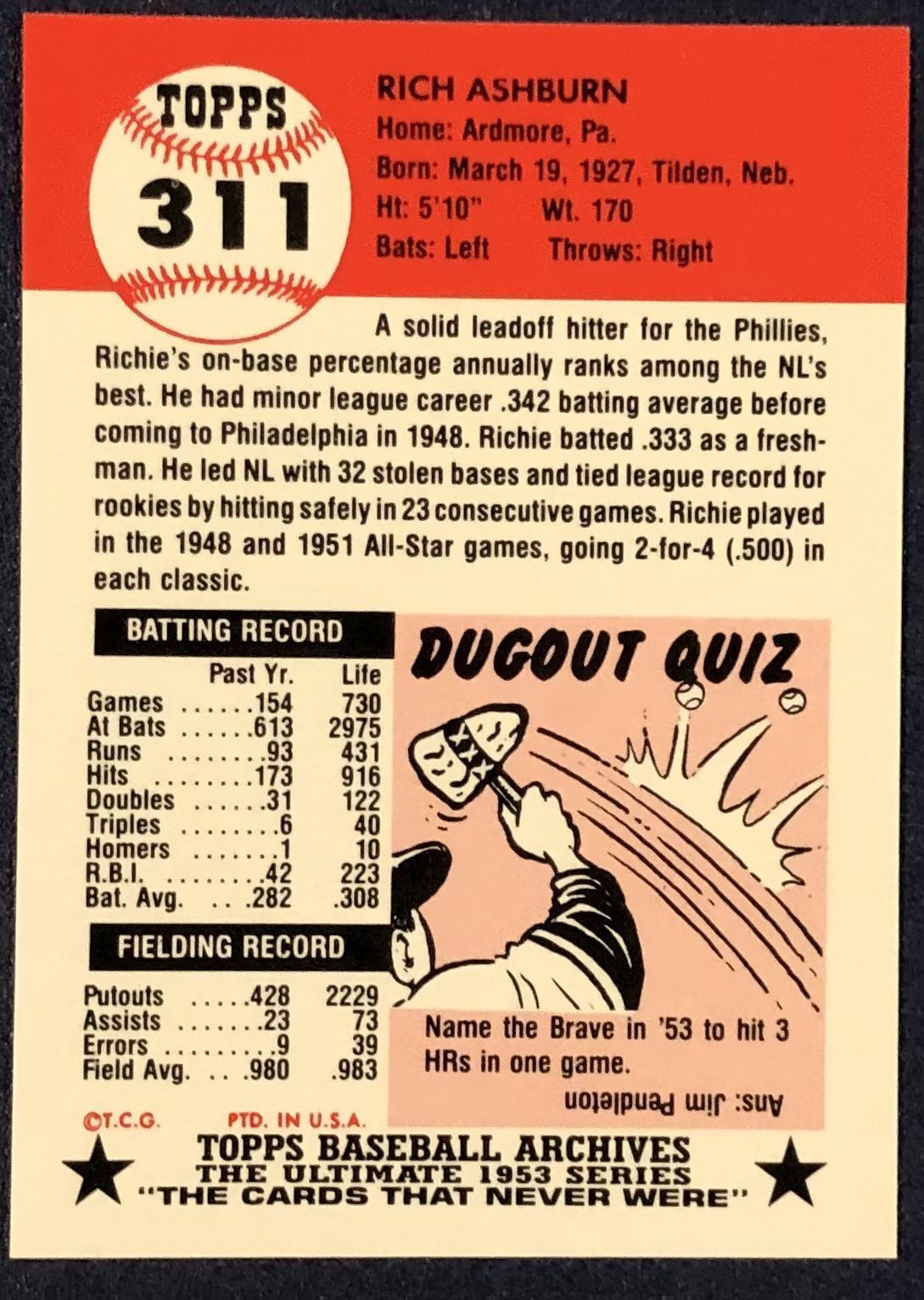 Lot 415 1991 TOPPS ARCHIVES (1953) RICHIE ASHBURN (HOF)