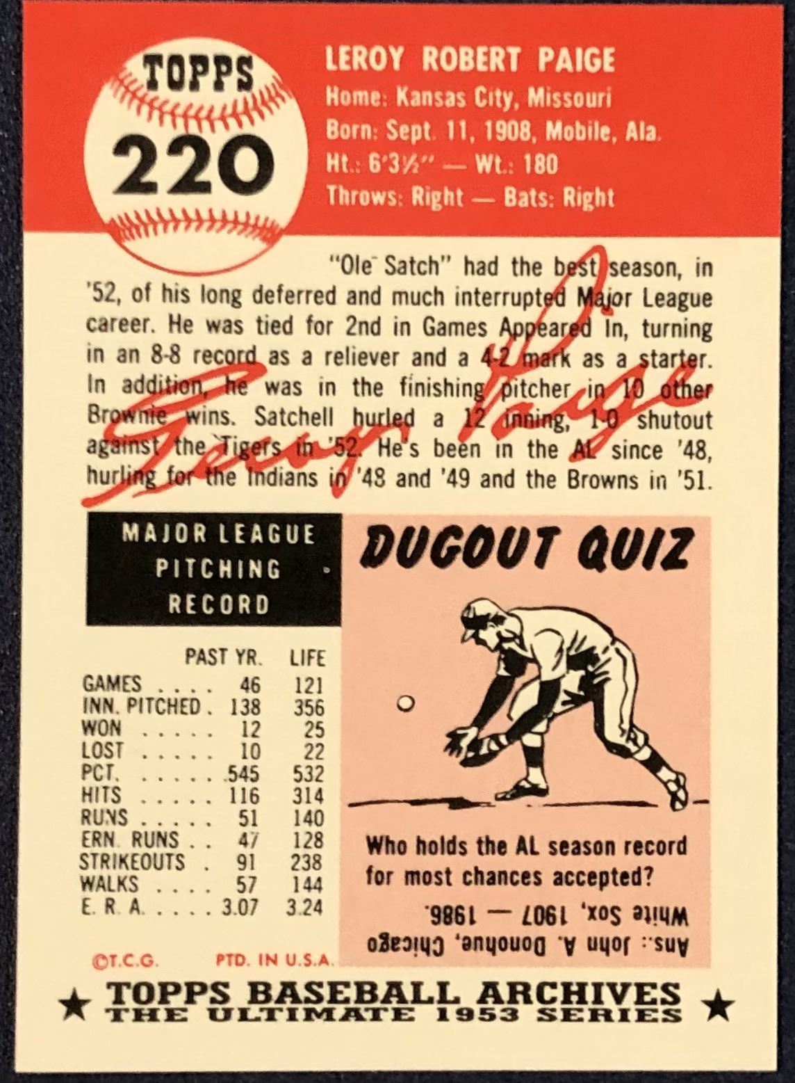 Lot 417 1991 TOPPS ARCHIVES (1953) SATCHELL PAIGE (HOF)
