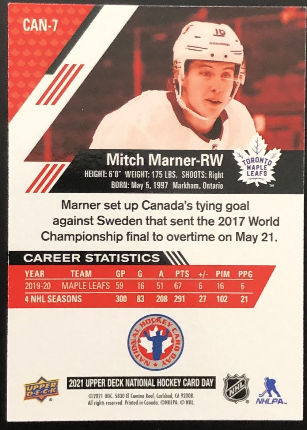 Lot 460 2020-21 UPPER DECK HOCKEY DAY MITCH MARNER