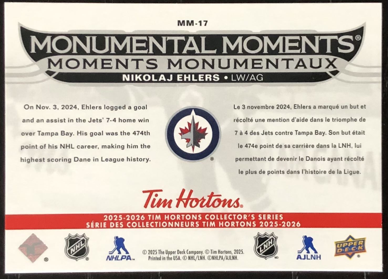 Lot 482 2025-26 UPPER DECK MONUMENTAL MOMENTS NIK EHLERS