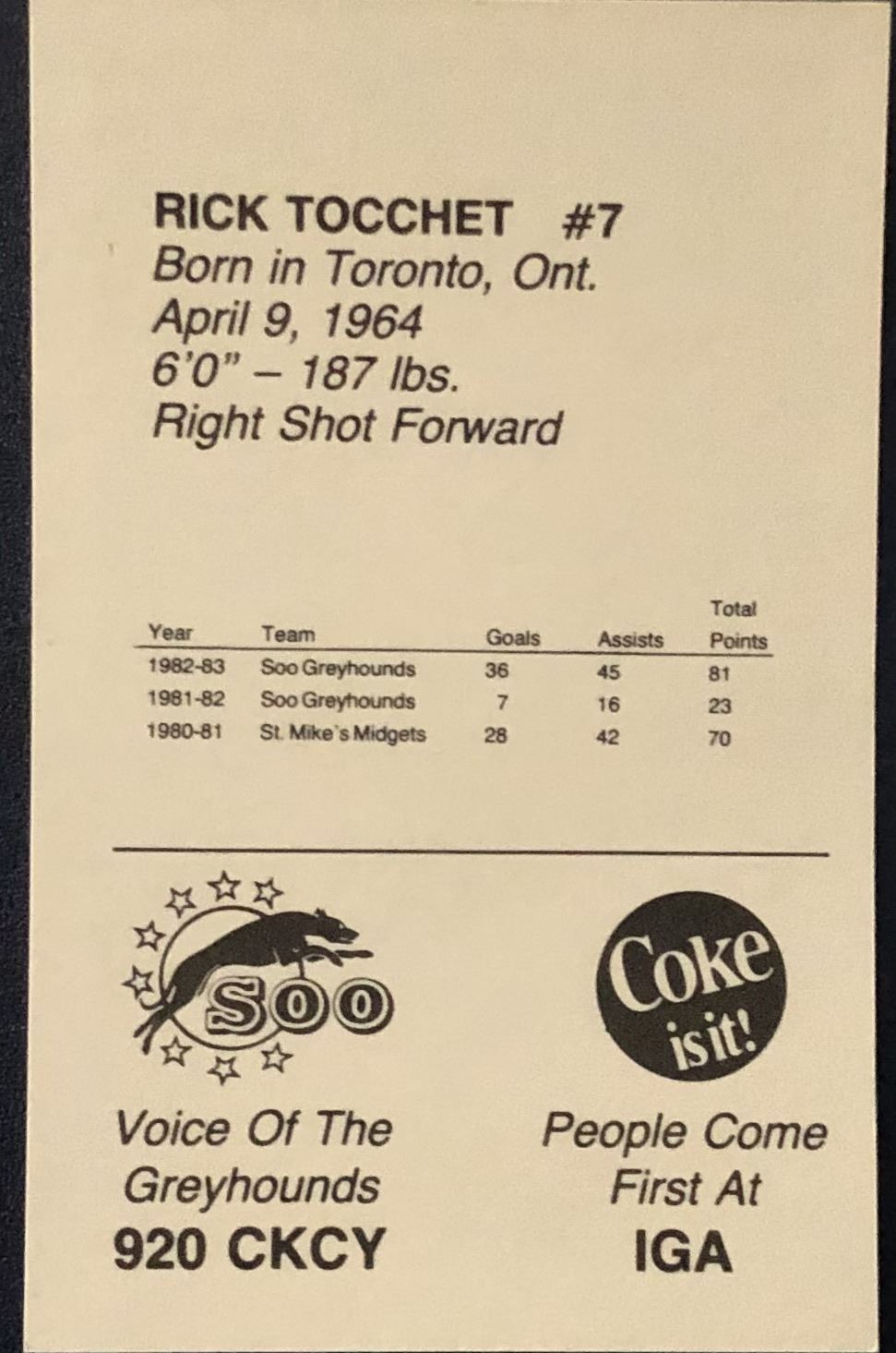 Lot 487 1983-84 RICK TOCCHET JUNIOR HOCKEY CARD