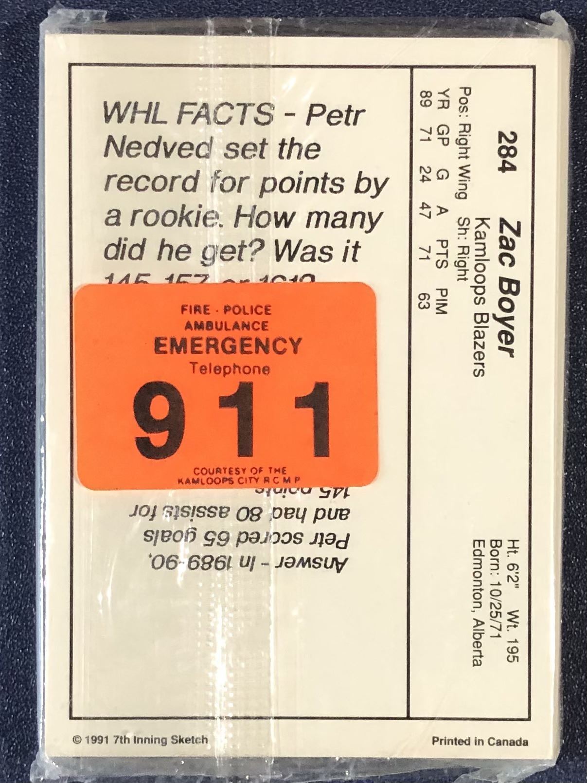 Produced by 7th INNING SKETCH, distributed by Kamloops police (PLAY PROGRAM). Set features Scott Niedermayer (HOF), Darryl Sydor, Corey Hirsch and more.