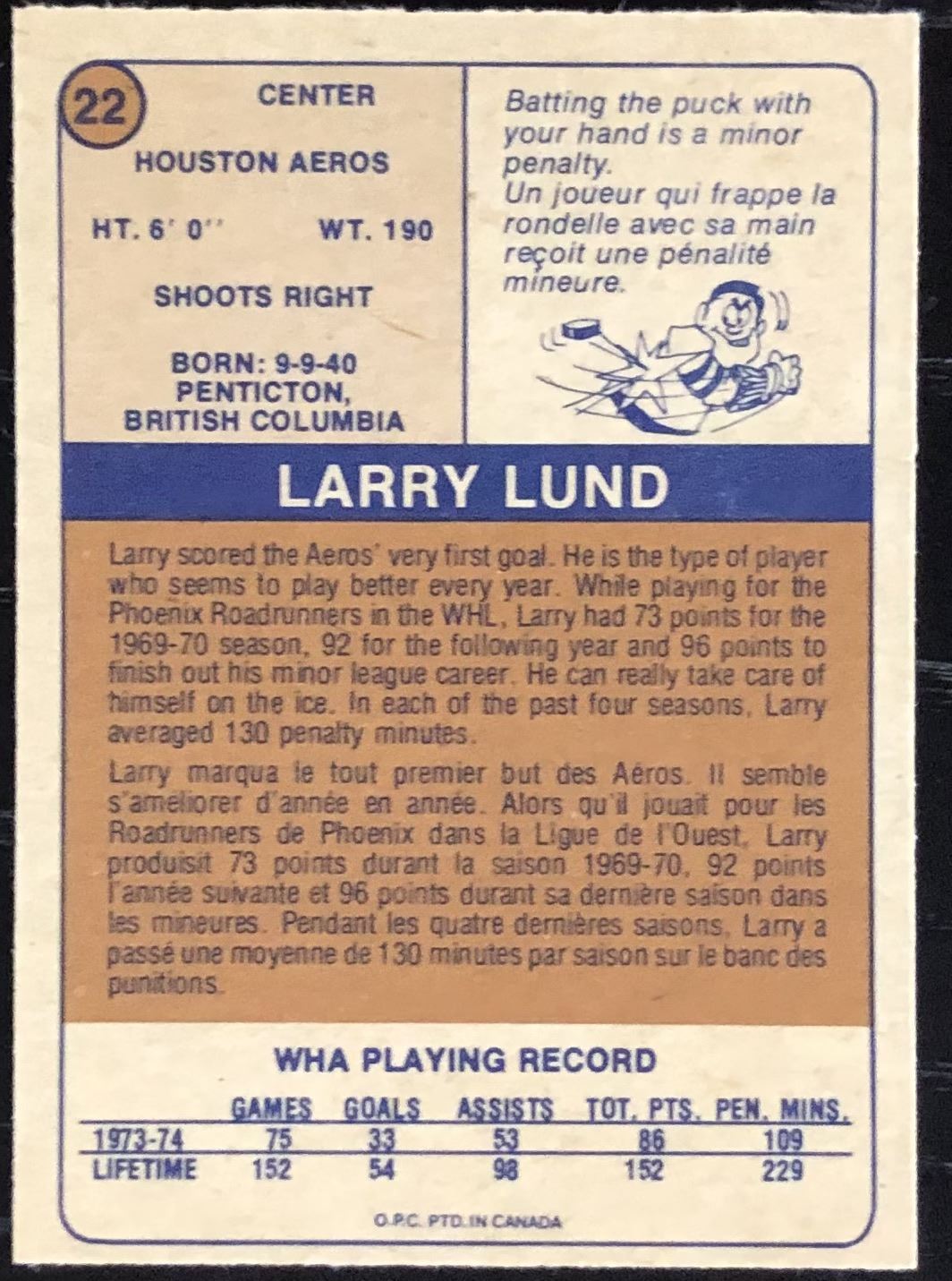 Card #22 WHA, hockey, vintage, OPC