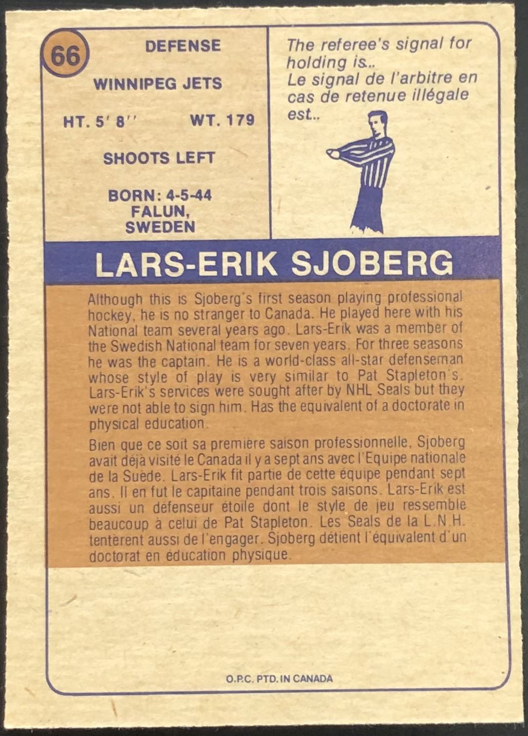 Lot 504 1974-75 O-PEE-CHEE WHA LARS-ERIK SJOBERG ROOKIE CARD