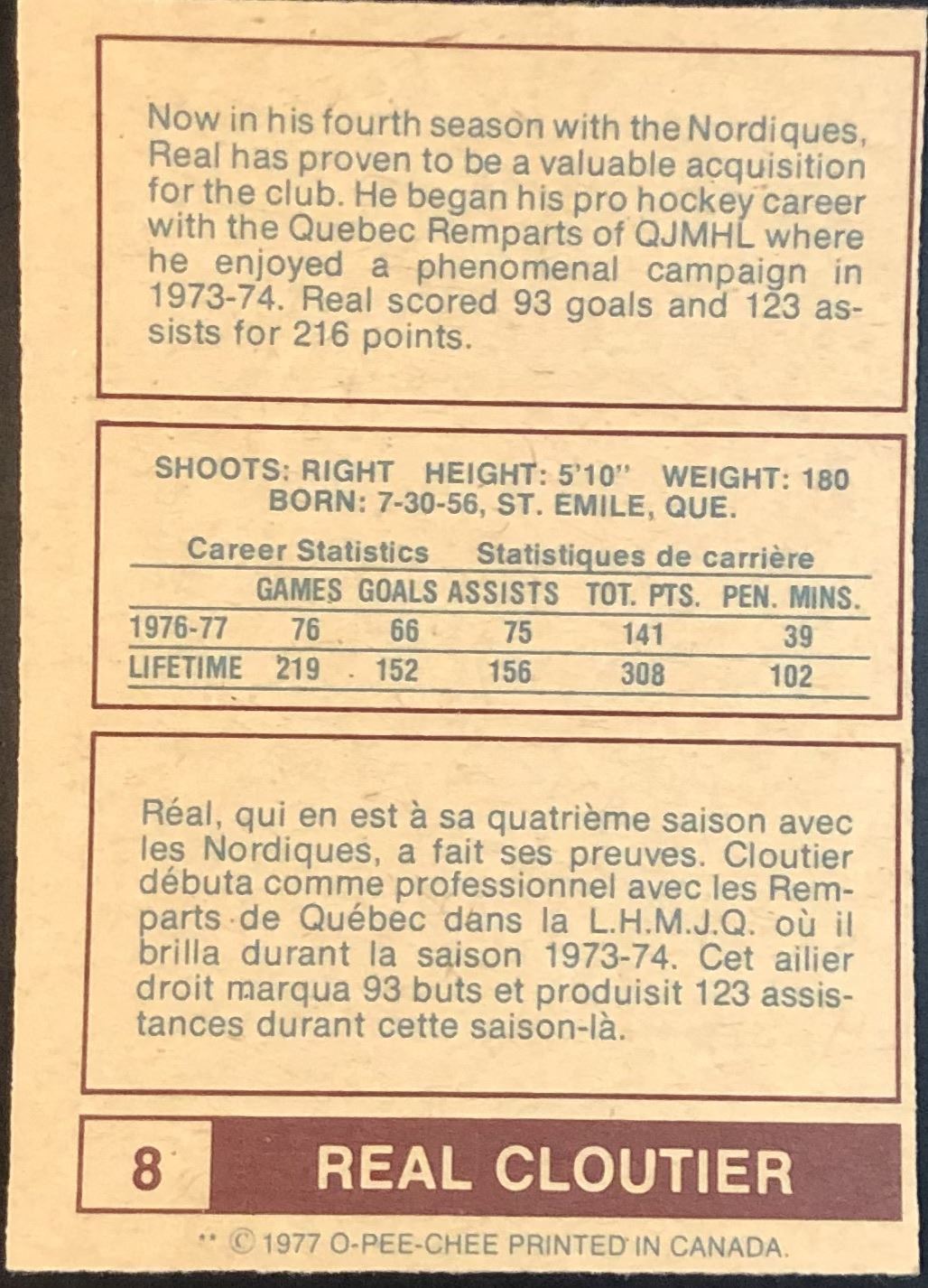 Lot 505 1977-78 O-PEE-CHEE WHA REAL CLOUTIER