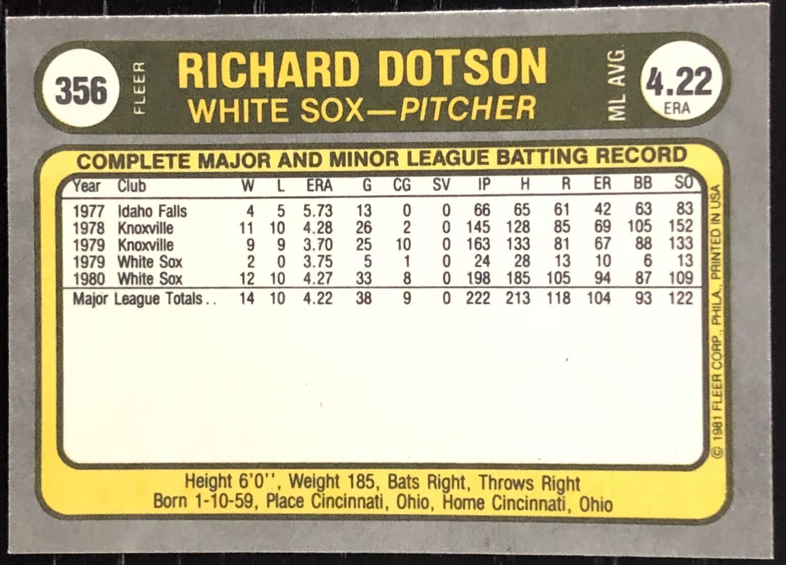Lot 540 1981 FLEER RICH DOTSON ROOKIE CARD
