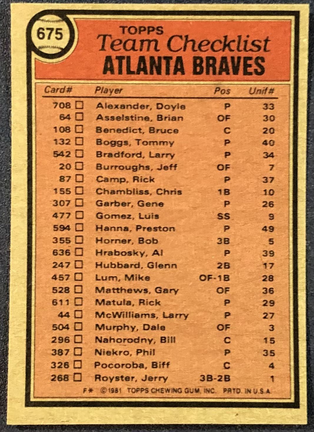 Lot 555 1981 TOPPS ATLANTA BRAVES