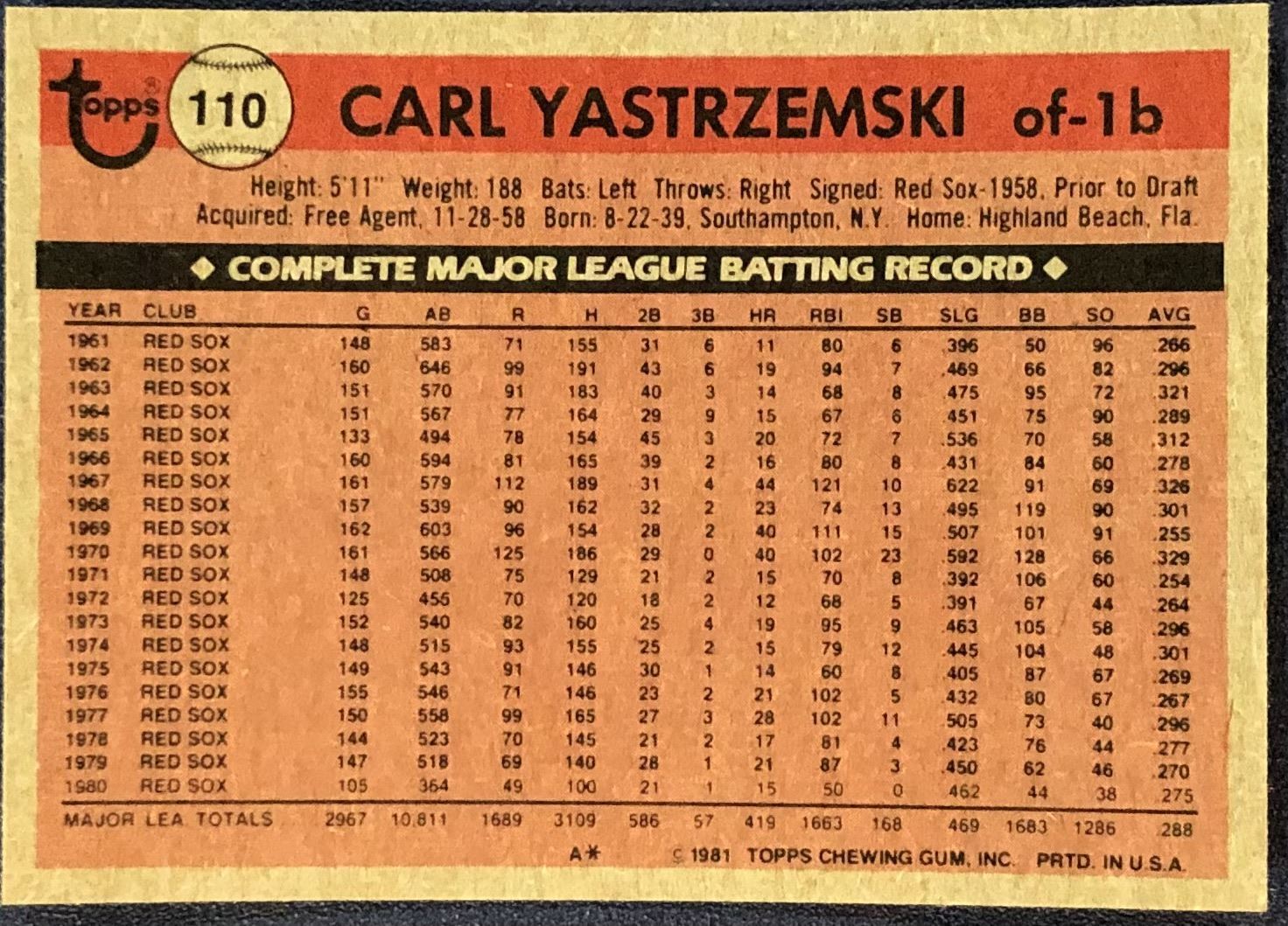 Lot 557 1981 TOPPS CARL YASTRZEMSKI (HOF)