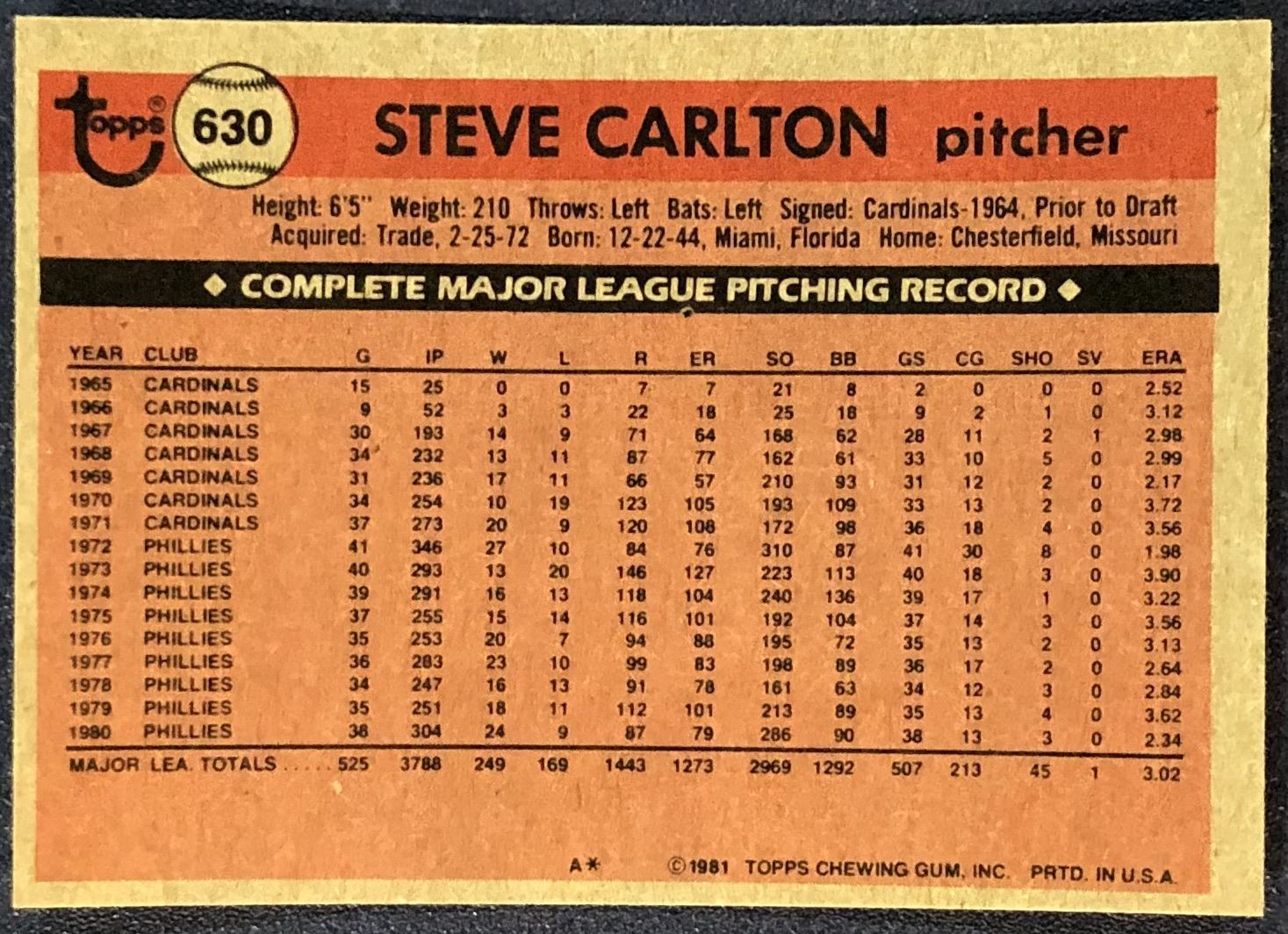 Lot 591 1981 TOPPS STEVE CARLTON (HOF)