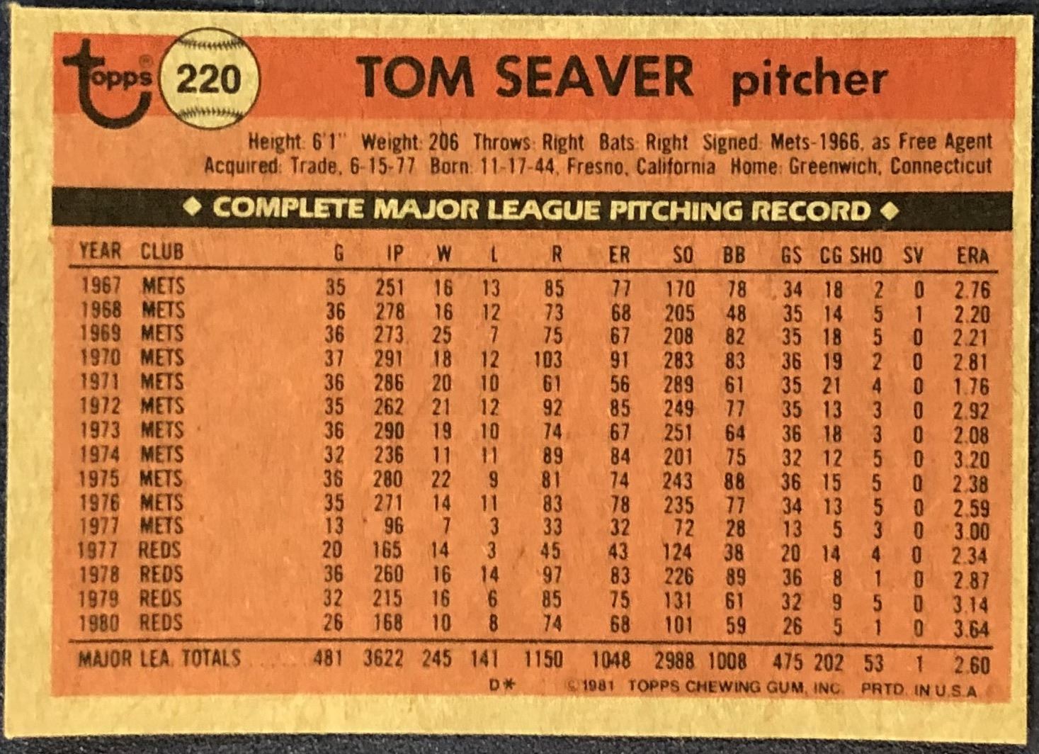 Lot 597 1981 TOPPS TOM SEAVER (HOF)