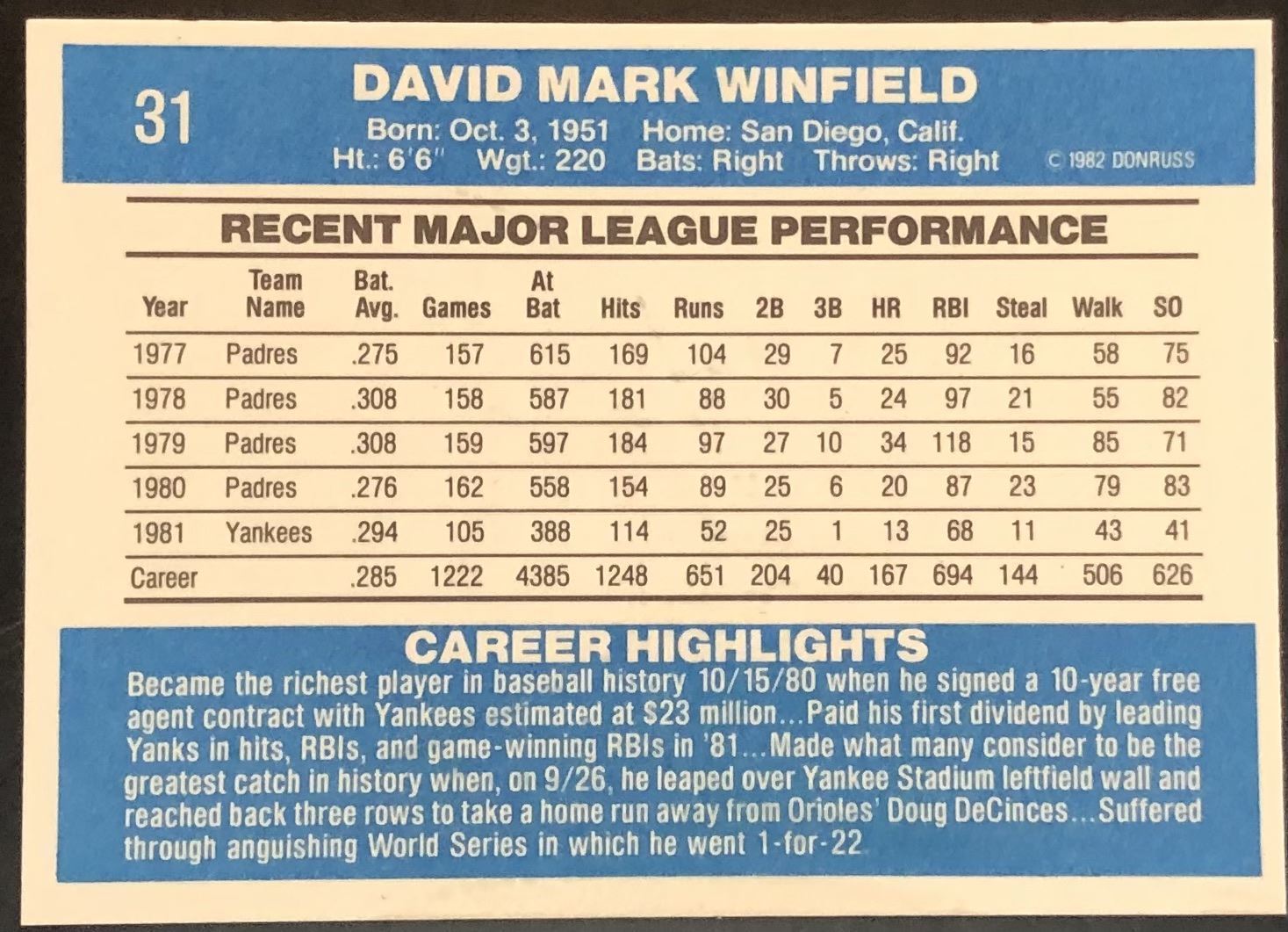 Lot 600 1982 DONRUSS DAVE WINFIELD (HOF)