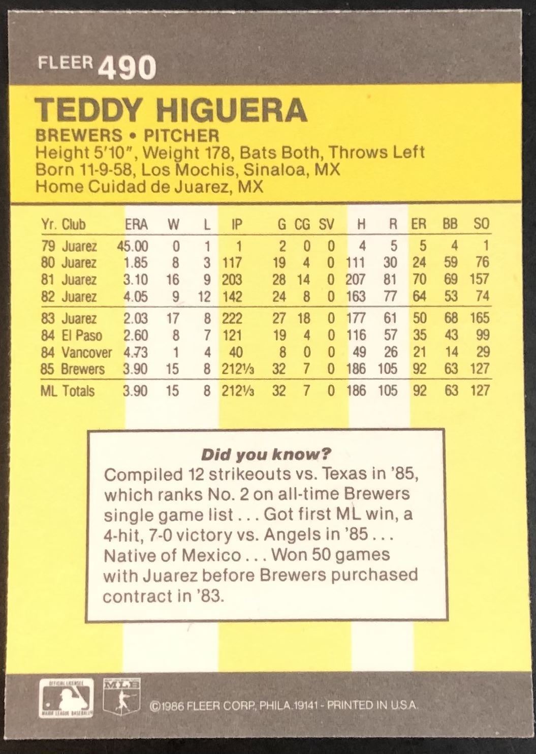 Lot 628 1986 FLEER TEDDY HIGUERA ROOKIE CARD